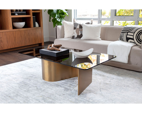 Bold and elegant, the Whisper Coffee Table is a staple for any living room area. The gorgeous brown tones of the tea tempered glass tabletop provide a gorgeous contrast to the gold S-shaped stainless steel base.