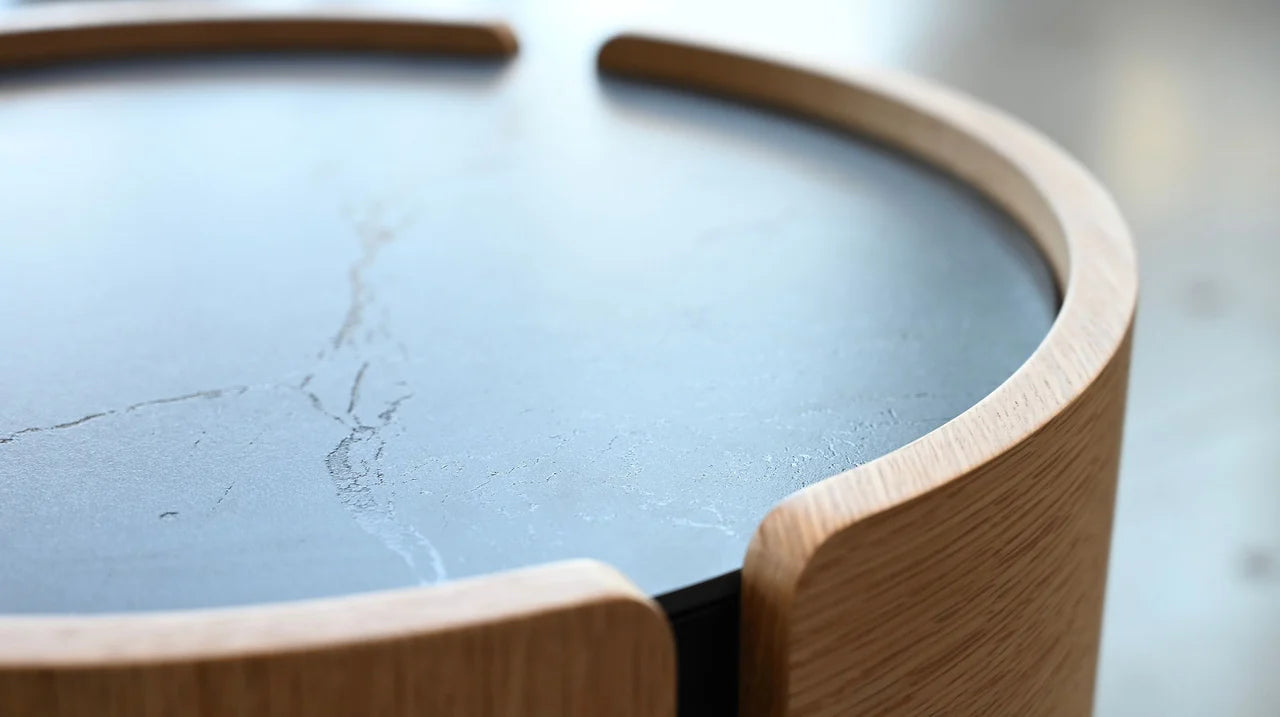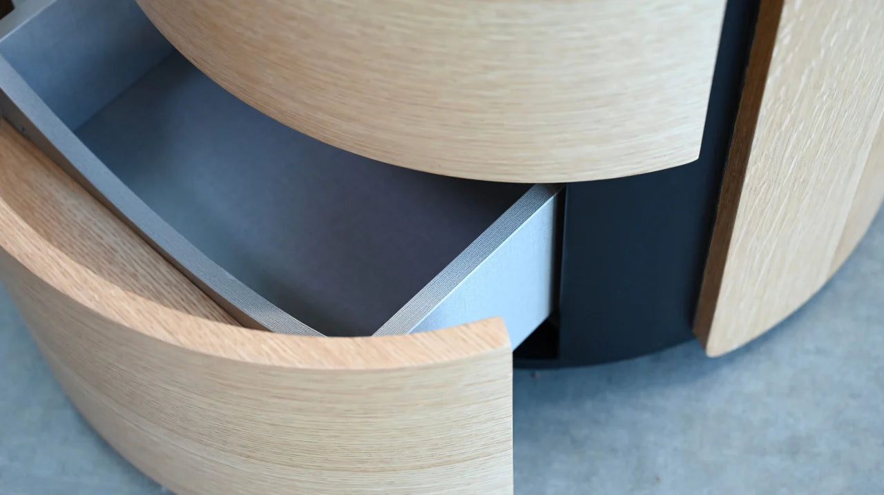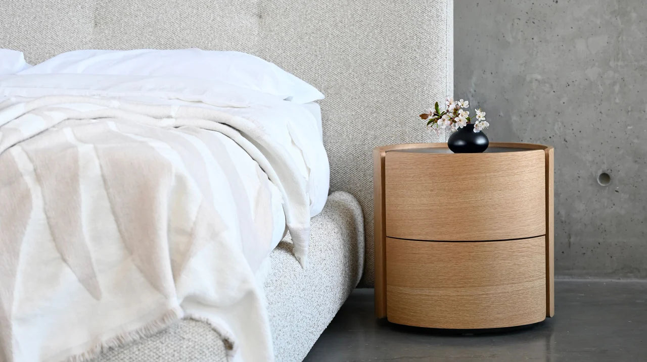 The Burrow Nightstand offers a minimal and clutter-free design. Featuring two drawers that provide ample bedside storage while maintaining a sleek appearance, its circular shape enhances the sense of space in smaller bedrooms, and the durable sinterstone top is available in white oak with black sinterstone or matte white with white sinterstone, adding both style and practicality.
