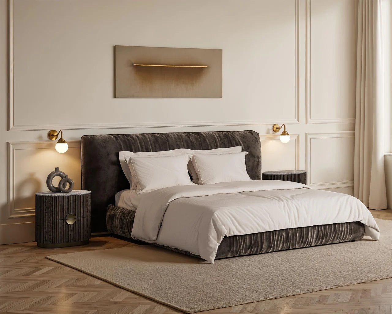 Introducing the Koii Collection: where elegance meets modern design. With its stunning silver-grey travertine marble top, this side table effortlessly enhances any space. Beautifully complemented by its fluted body and finished in an oiled ebony ash, its rounded edges add a touch of softness, inviting warmth and intimacy to your gathering. This collection offers versatility with additional options, including a sideboard and bar cabinet. Each piece is designed to create a cohesive look.