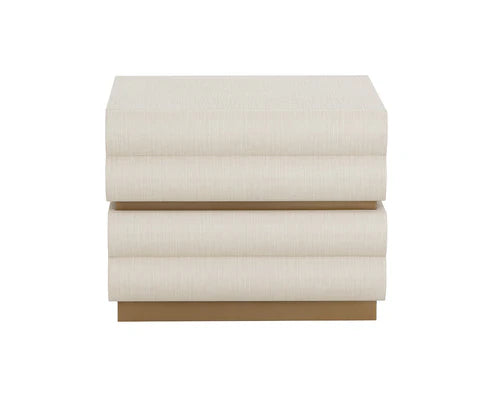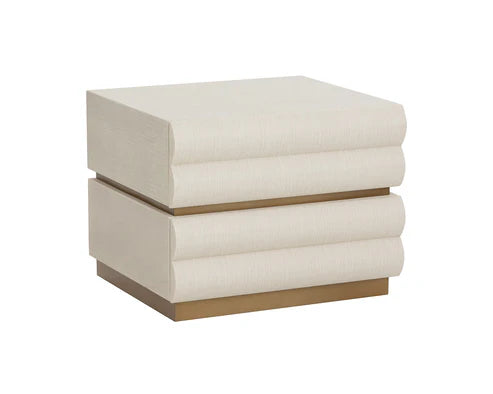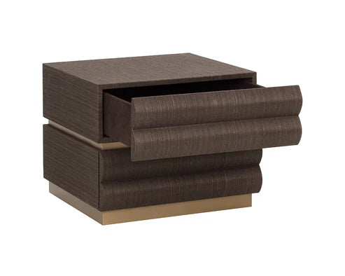 The Subira Nightstand brings sculptural detail to the bedroom with its tiered drawer fronts, crafted from rubberwood and wrapped in cream or chocolate raffia for a textured finish. Resting on a golden stainless steel base, the design is elevated by a subtle metallic sheen. Its two spacious drawers open to reveal velvet-lined interiors, combining practicality with a tactile finish.
