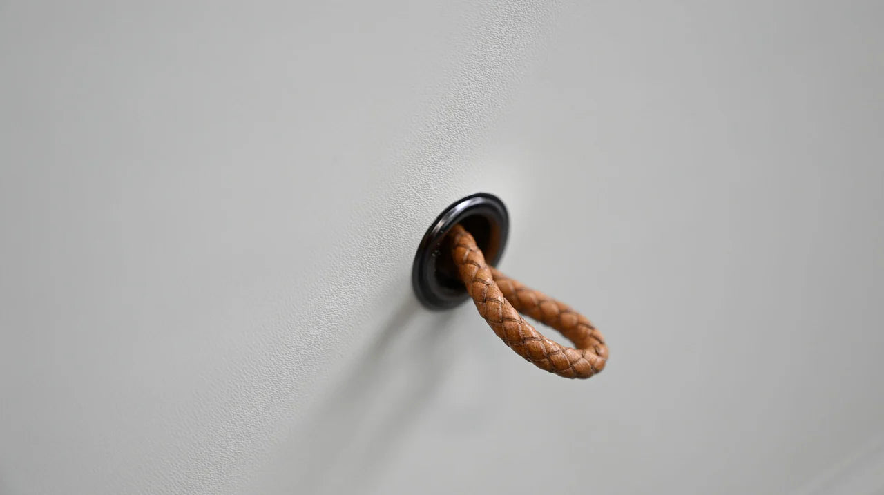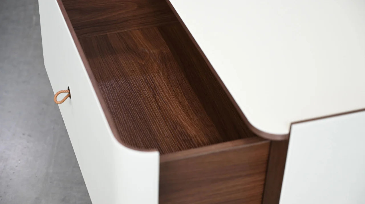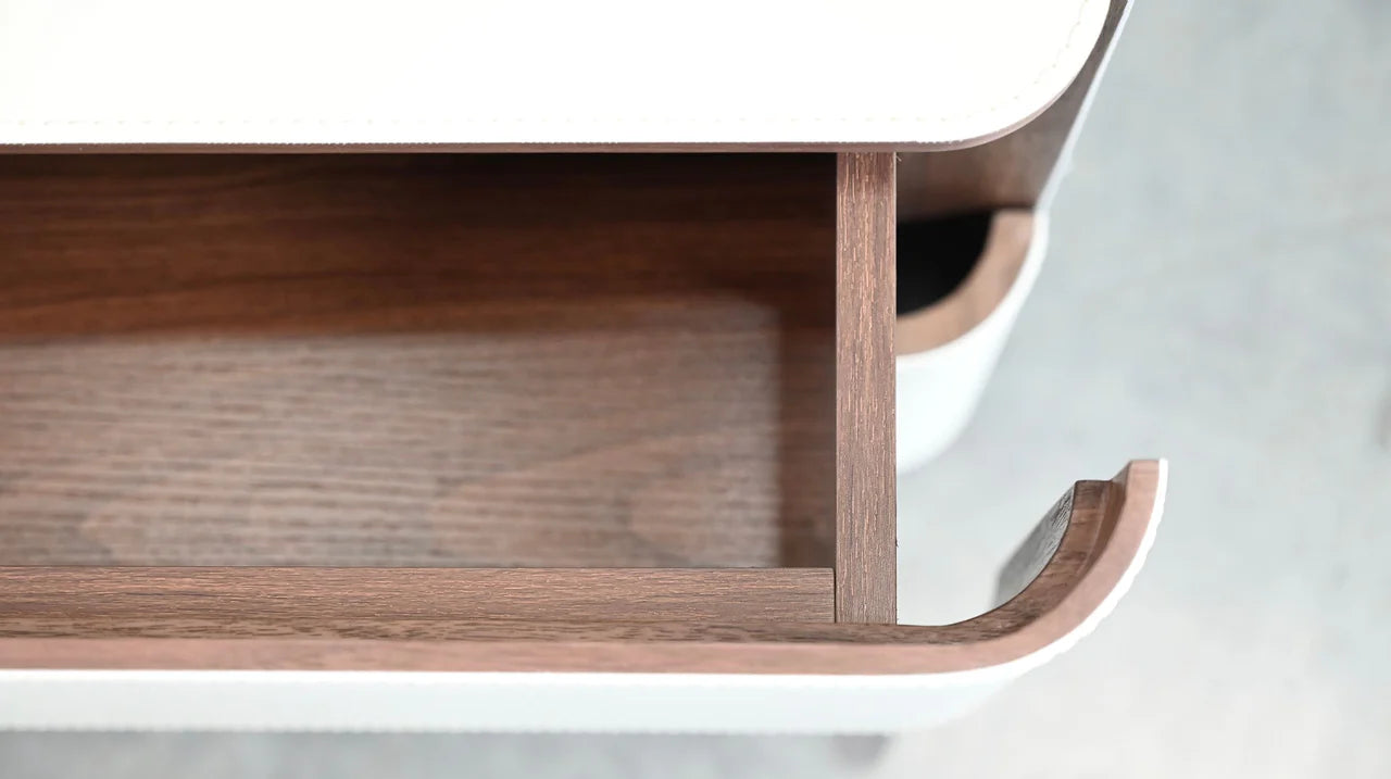 The Sumu Nightstand is upholstered in leather. This piece offers a minimal, clutter-free design, featuring three drawers with leather pulls that provide ample bedside storage while maintaining a sleek appearance. Its curved edge shape enhances the sense of space in smaller bedrooms.