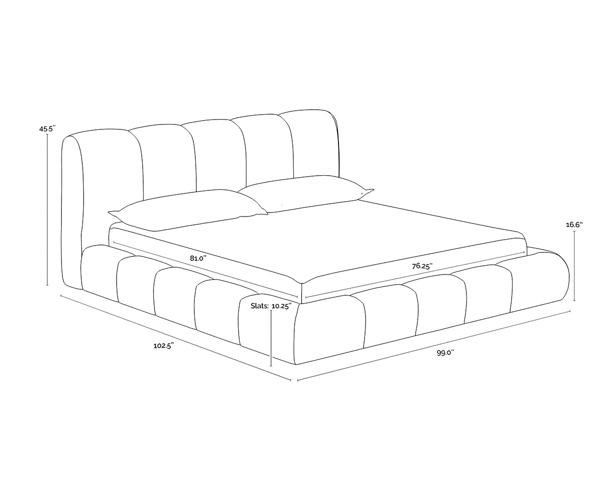 Embrace the luxuriously plush and cozy Olena Bed. A true statement piece that is generously cushioned and upholstered in smooth meg ash or santa cruz oatmeal fabric with vertical channels. No box spring is required and folding slats are included.