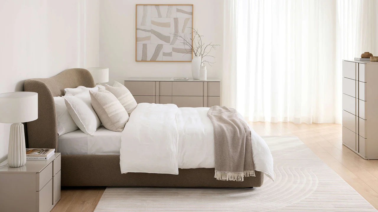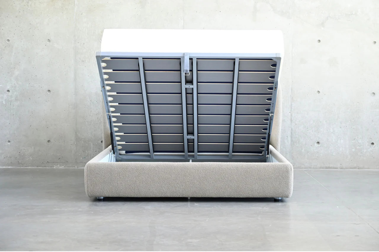 The Harlow Upholstered Storage Bed in putty teddy fabric seamlessly blends contemporary design with practicality. Its plush, high headboard exudes sophistication, while the putty teddy fabric adds a touch of luxury. Cleverly concealed underneath is ample storage, combining style and functionality for a modern and organized bedroom retreat.