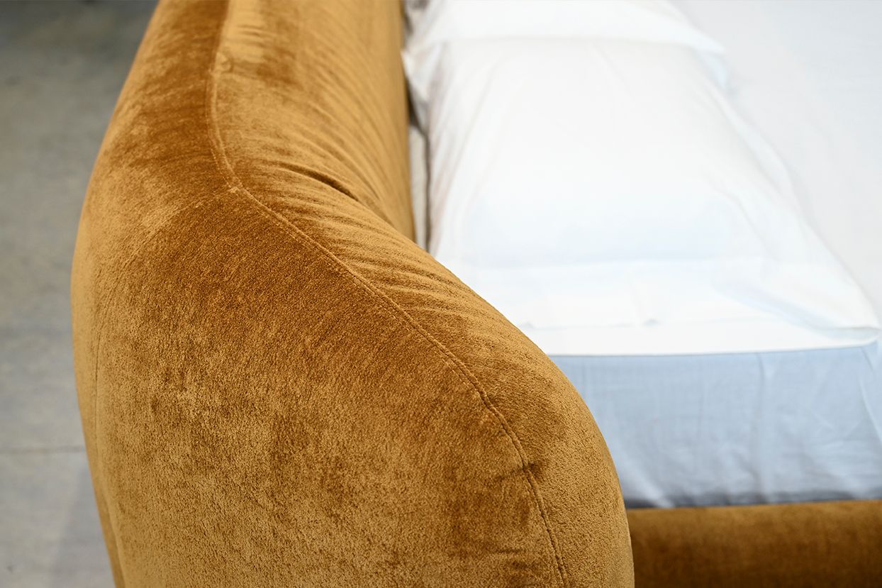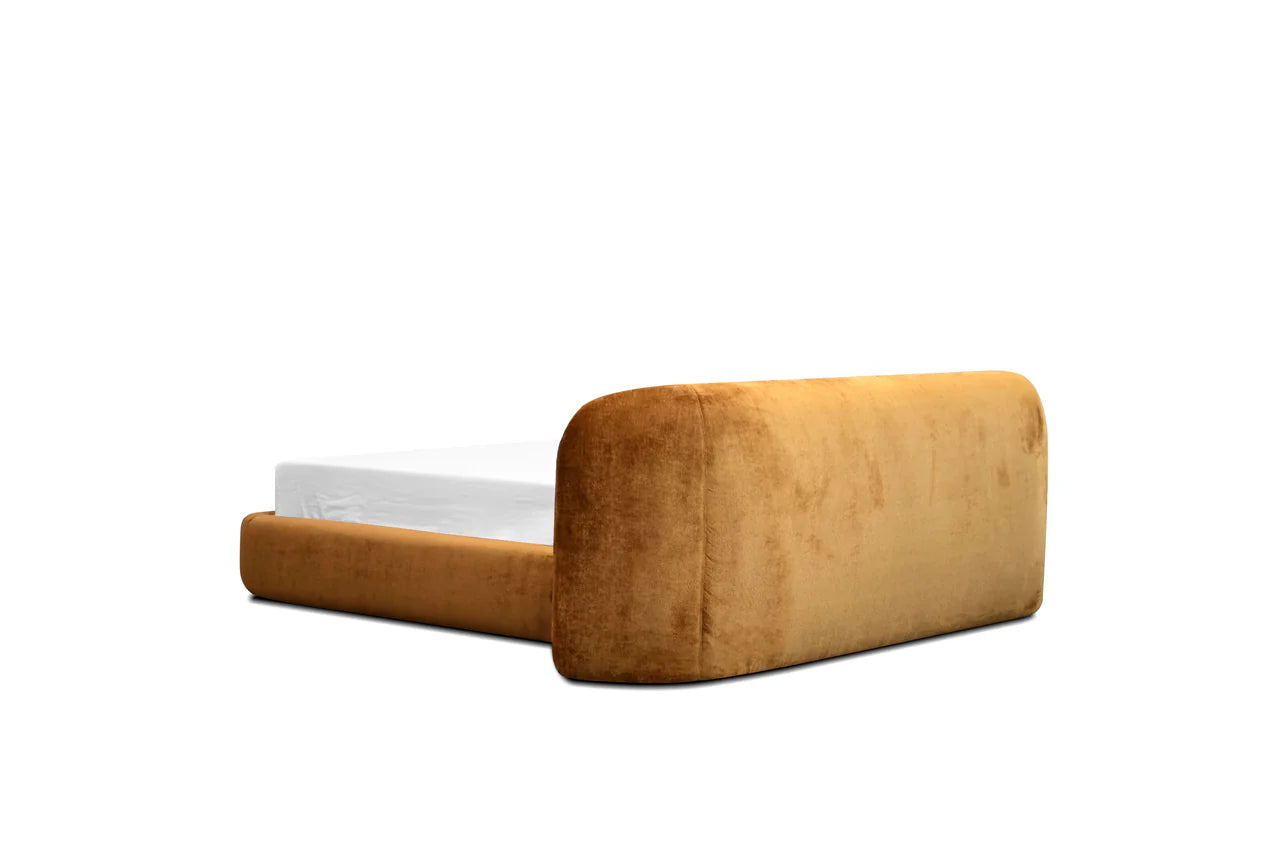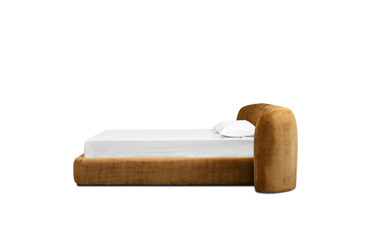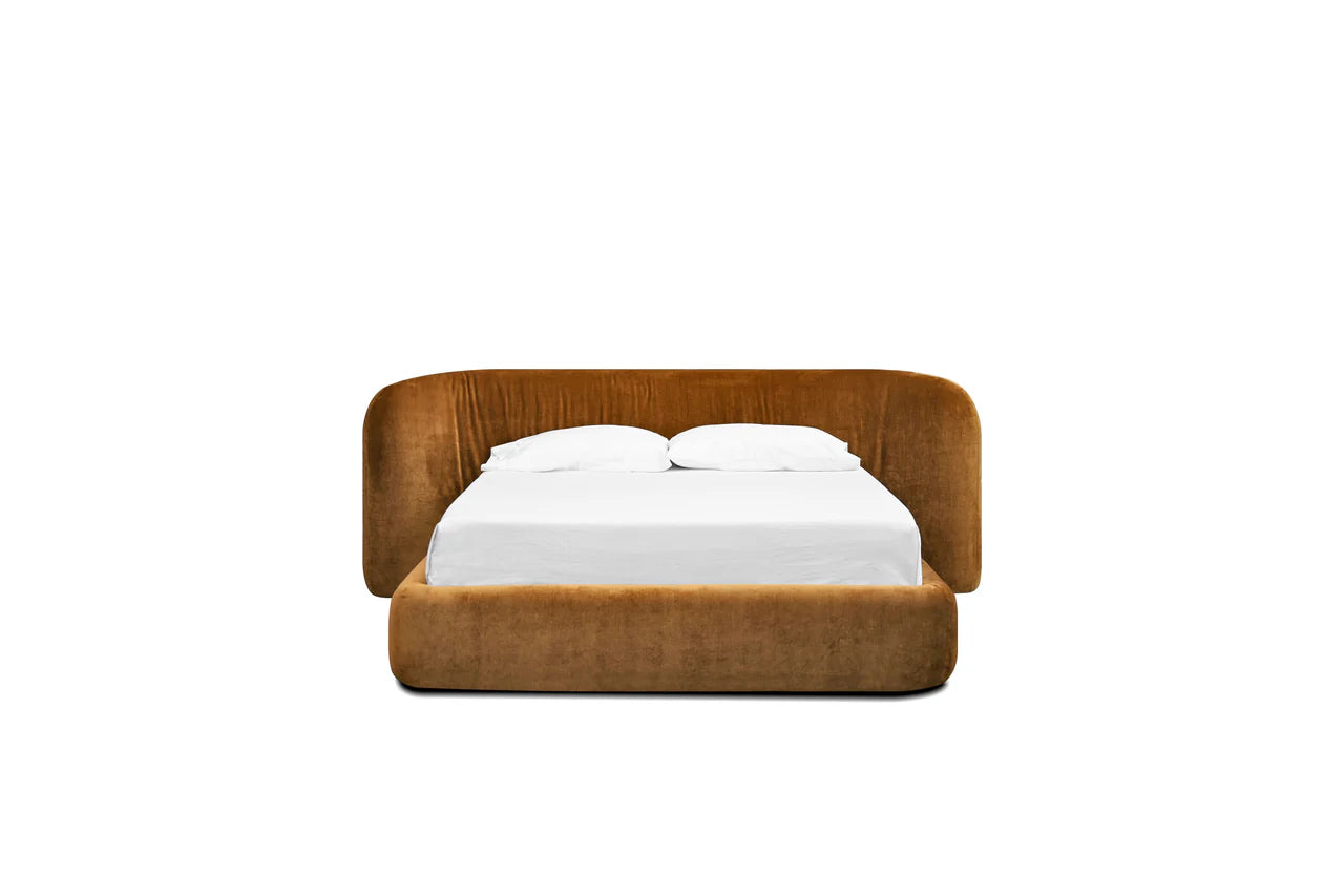 The Kurv Bed offers a cozy and inviting atmosphere with its low-profile frame and a beautifully curved thick headboard. Available in both king and queen sizes in roasted pumpkin fabric, this design combines modern aesthetics with comfort, making it a perfect focal point for any bedroom.