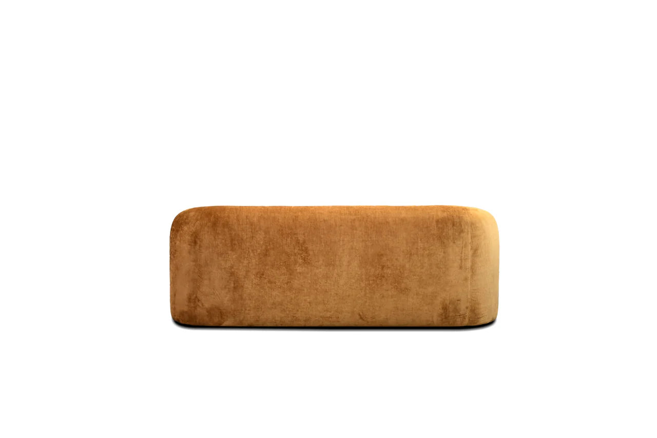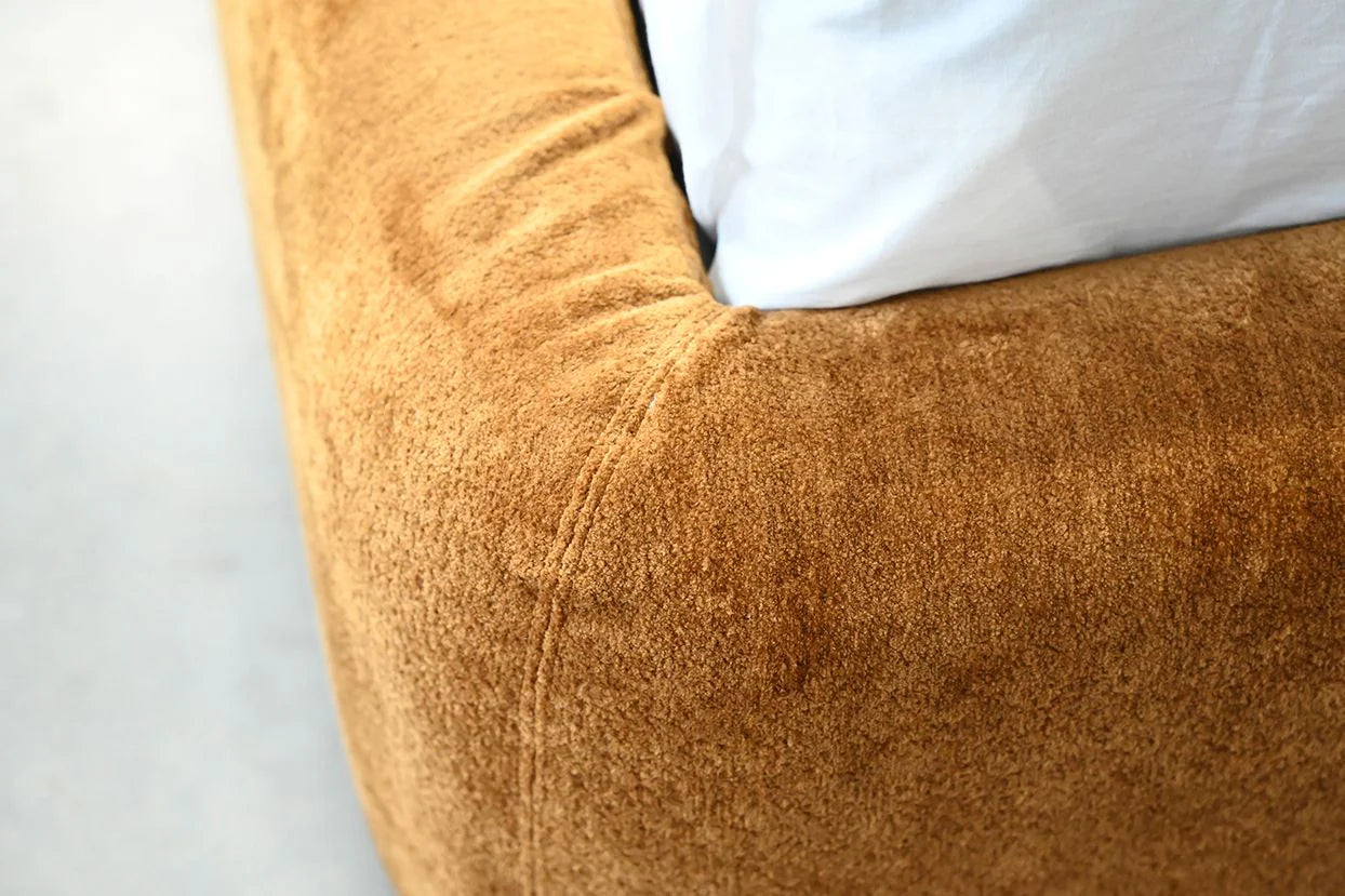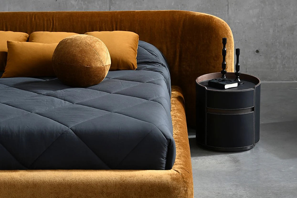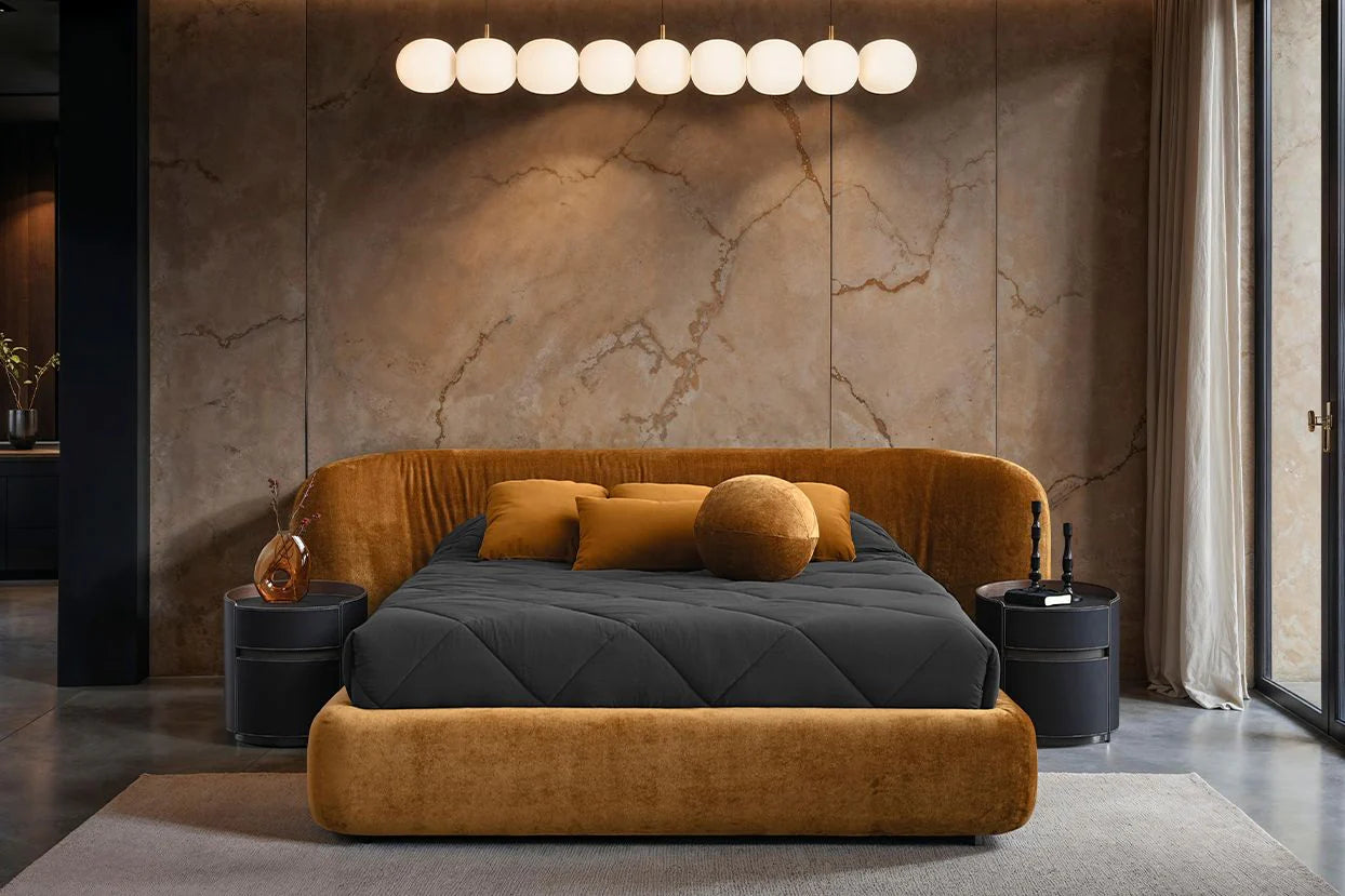 The Kurv Bed offers a cozy and inviting atmosphere with its low-profile frame and a beautifully curved thick headboard. Available in both king and queen sizes in roasted pumpkin fabric, this design combines modern aesthetics with comfort, making it a perfect focal point for any bedroom.