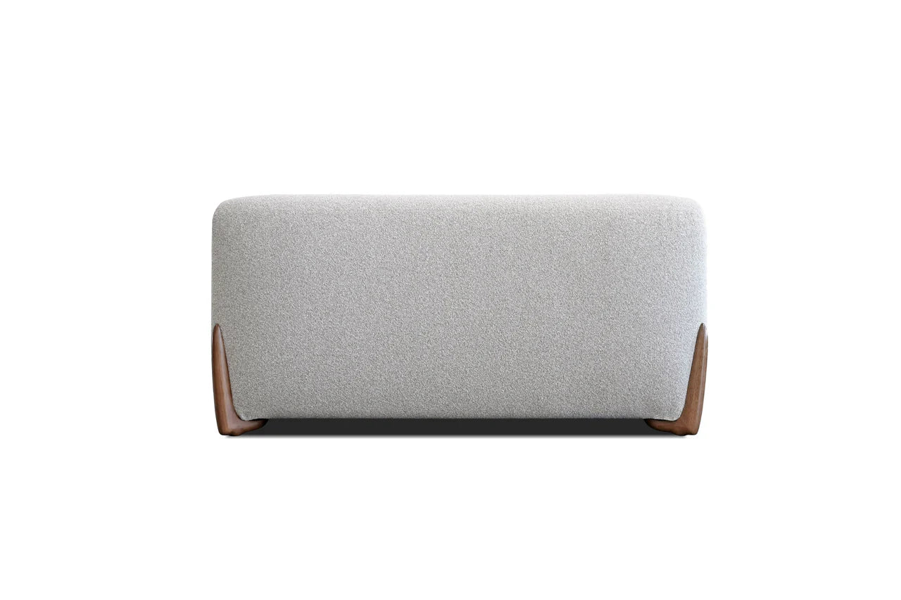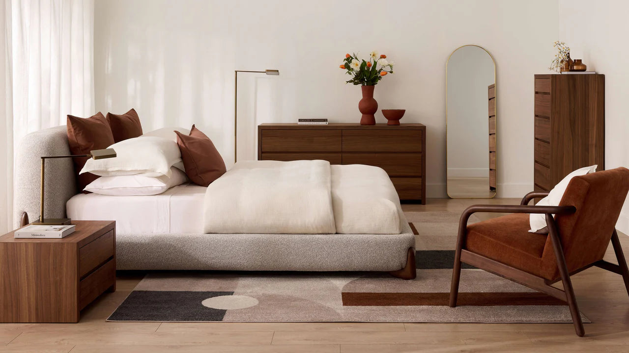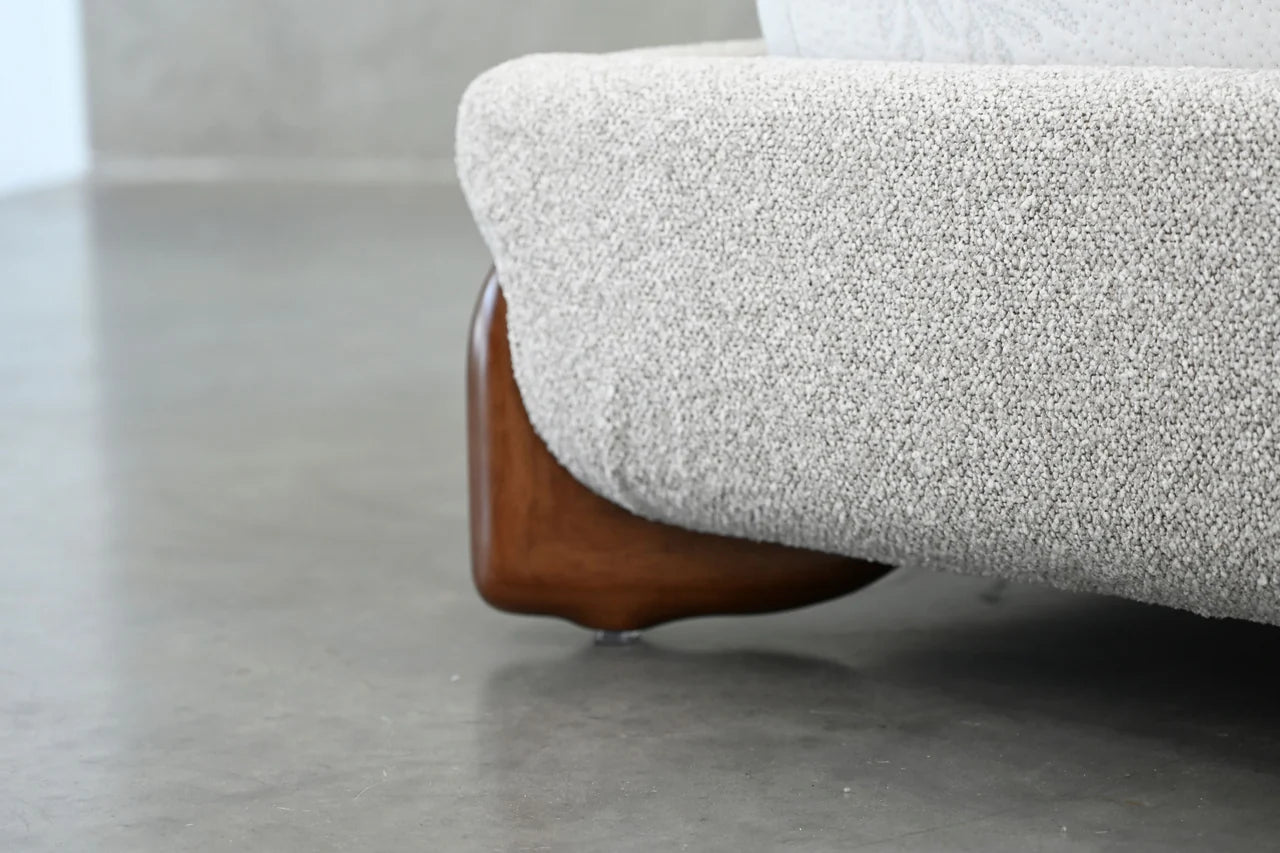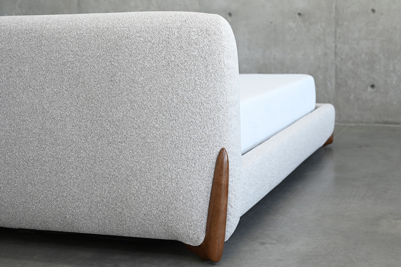 The Mesa Bed is upholstered in a nubbly oat tweed fabric which seamlessly merges classic design with contemporary appeal. Its minimalist frame and headboard allow the distinctive walnut leg design to command attention. Available in both king and queen.
