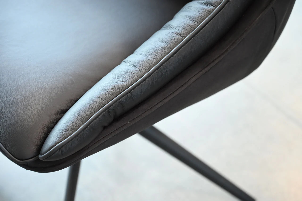 The Huracan Dining Chair features a stylish 360-degree swivel base made from bronze powder-coated steel. It is upholstered in a chic two-toned design, combining a bruno alcantara outer with a durable bronzo zante leather seat, ensuring both elegance and resilience.
