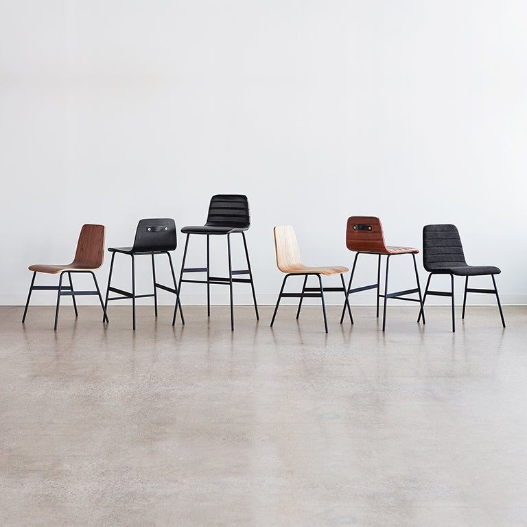 The Lecture Dining Chair is a modern reinterpretation of a classic elementary school chair design. This version features a one-piece, upholstered seat and back, with unique, channel-stitch detailing. Select upholstery is made from 100% recycled plastic bottles, diverted from landfills and waterways, then repurposed into upholstery material. The back incorporates a functional leather and brass handle. The black, powder-coated steel legs are reinforced with solid metal stabilizers.