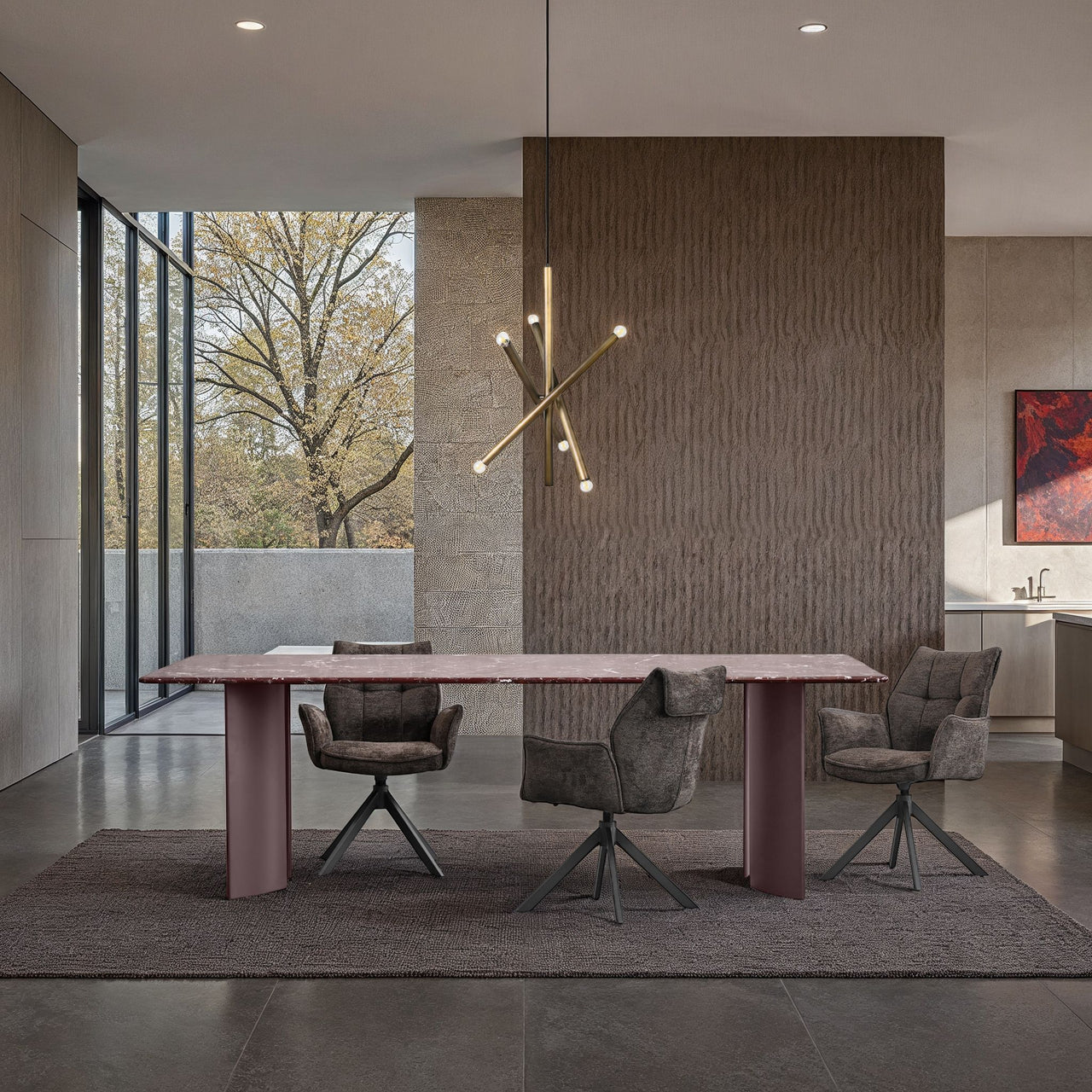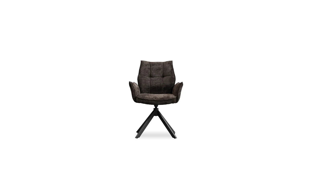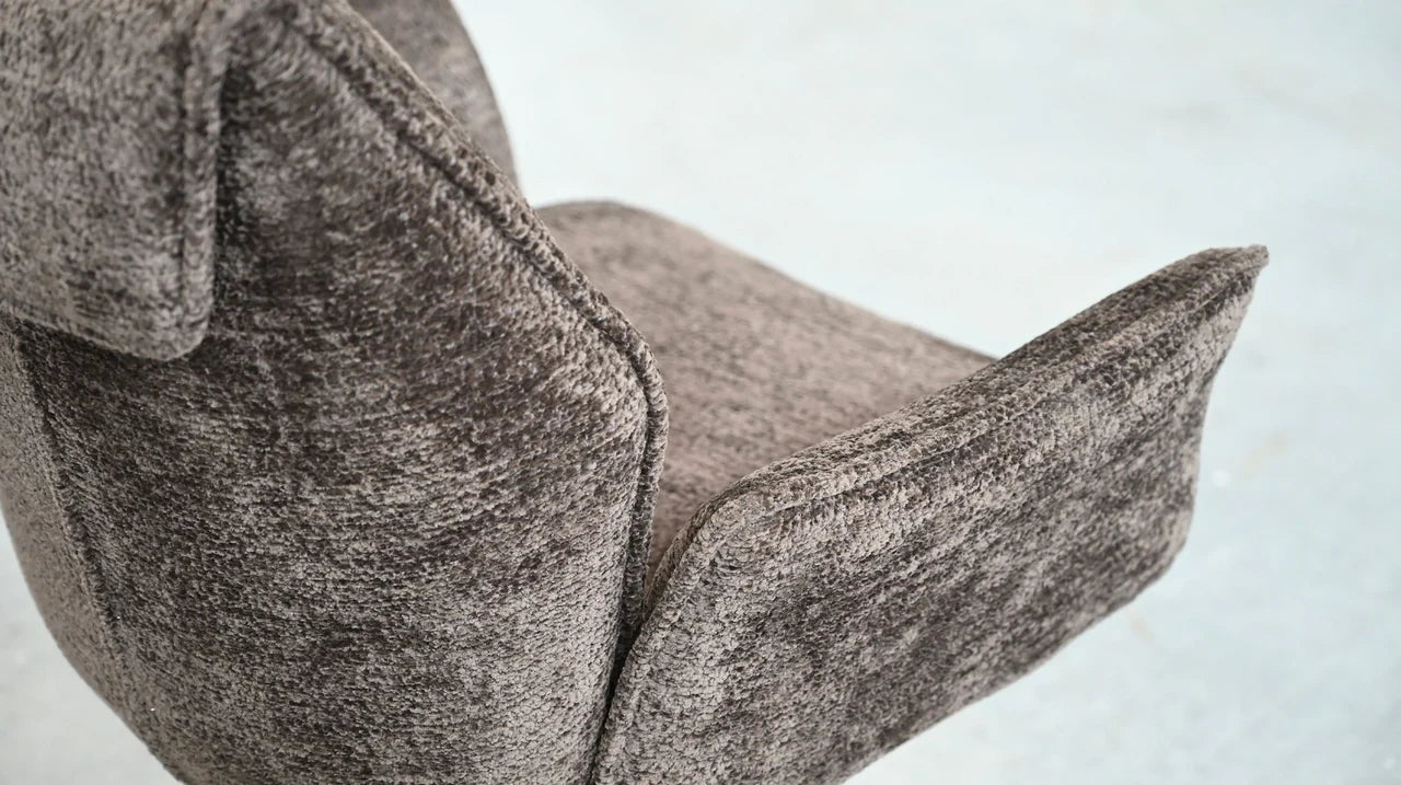 The Louis Swivel Dining Chair combines comfort and functionality with a 360-degree swivel, high back, and armrests. It's upholstered in a timeless espresso chenille fabric and features a black powder-coated steel base.