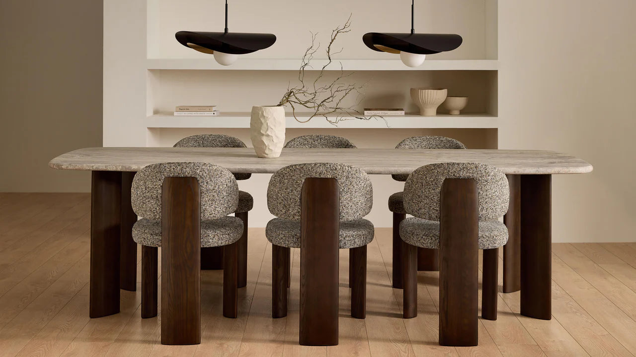 The Sake Dining Chair features a luxurious super-soft koala grey tweed fabric, enriched with warm brown undertones that beautifully complement its striking ebony ash legs. With an innovative three-leg design--where the back leg extends elegantly to the top of the backrest--this chair offers a unique aesthetic that pairs perfectly with the Shoku Dining Table and Koii Sideboard for a stunning dining ensemble.