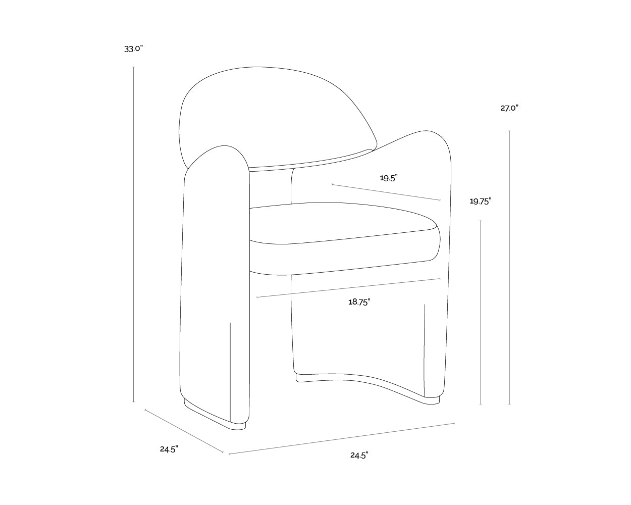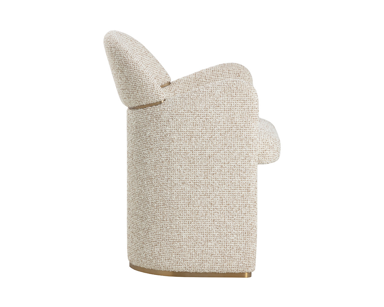 The Snowden Dining Armchair is a conversation starter. Textured performance fabric, art deco curves, and soft angles create a unique, geometric silhouette that captivates from all sides. Gold metal inlay on the backrest and on the legs ties the modern look together.