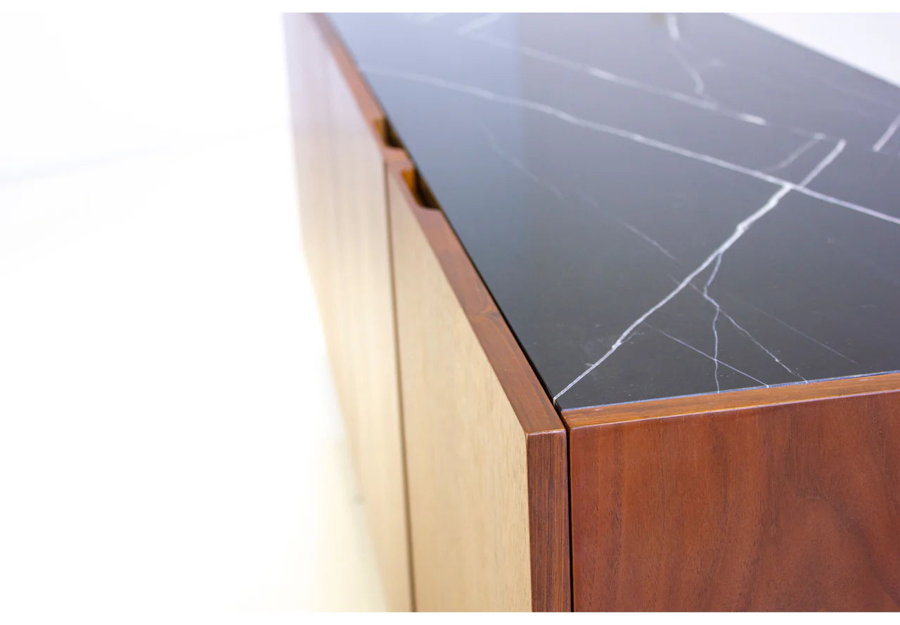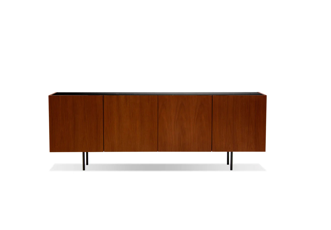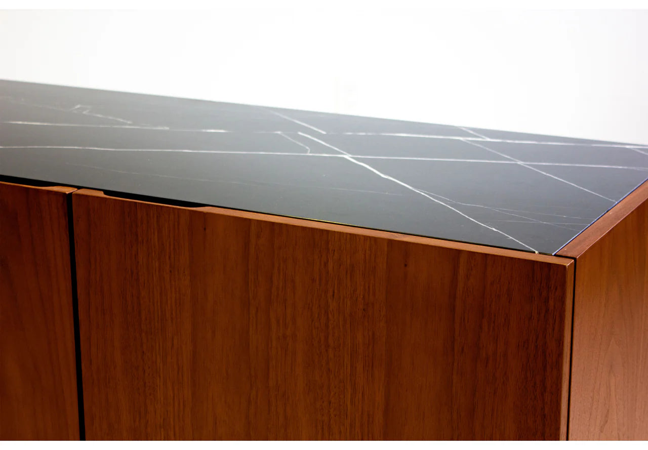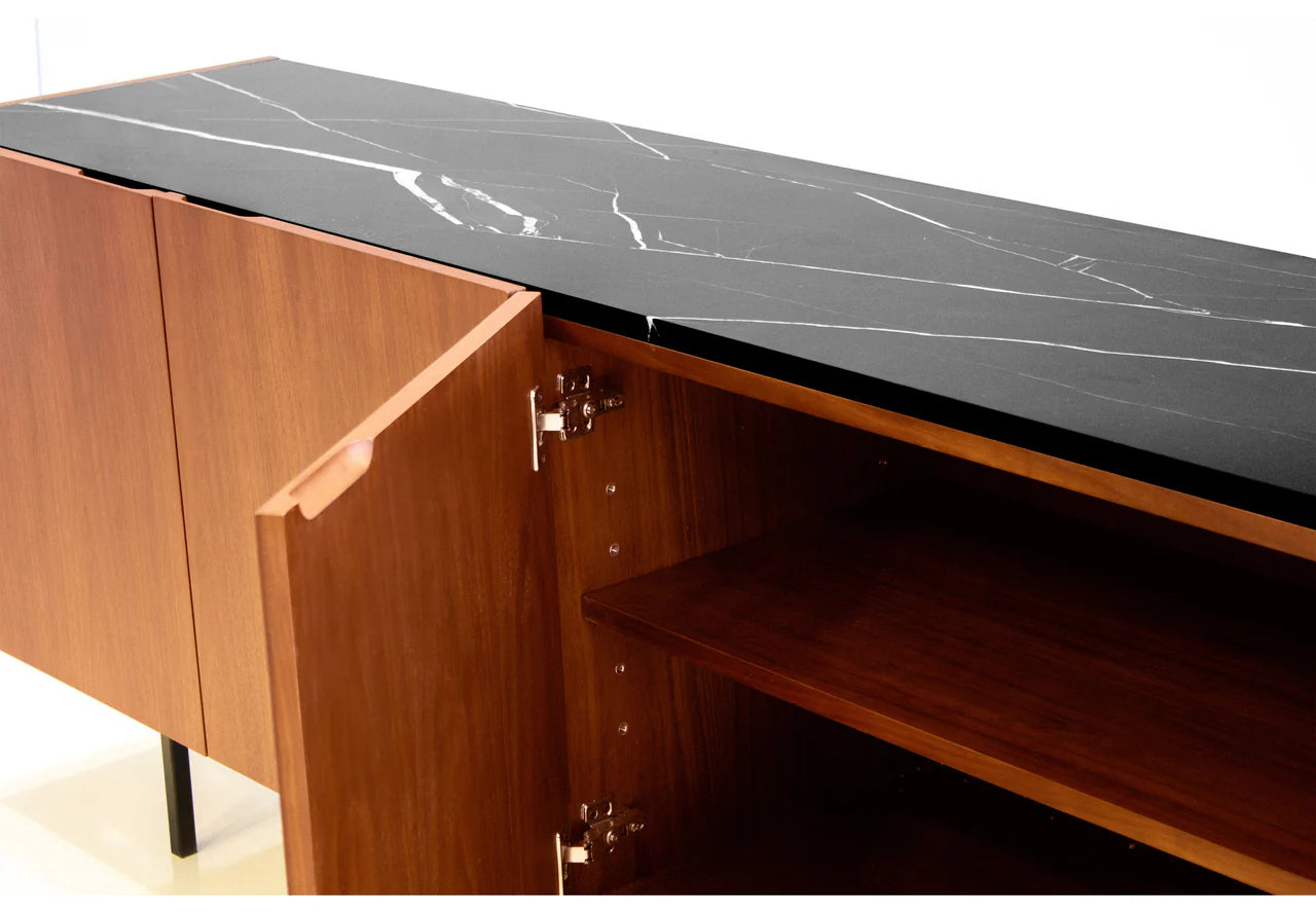 The Calvin Buffet is the minimalist's anchor in any room setting. Its size is versatile in many room settings. Use it as a buffet in your dining room, an entry piece in your front foyer, or as a media cabinet in your living room. The cabinet is made from walnut wood and features a flush-inserted nero marquina black marble top. The cut-out soft-close door pulls make the front surface sleek without any door hardware. Inside the buffet doors is a long, single shelf, spanning each half of the cabinet. The legs are made from solid steel that's painted black.