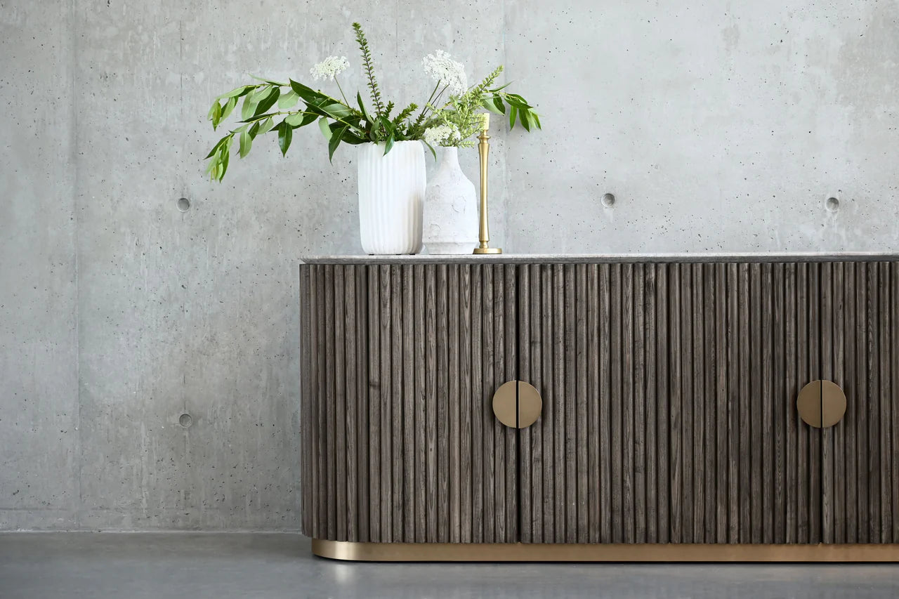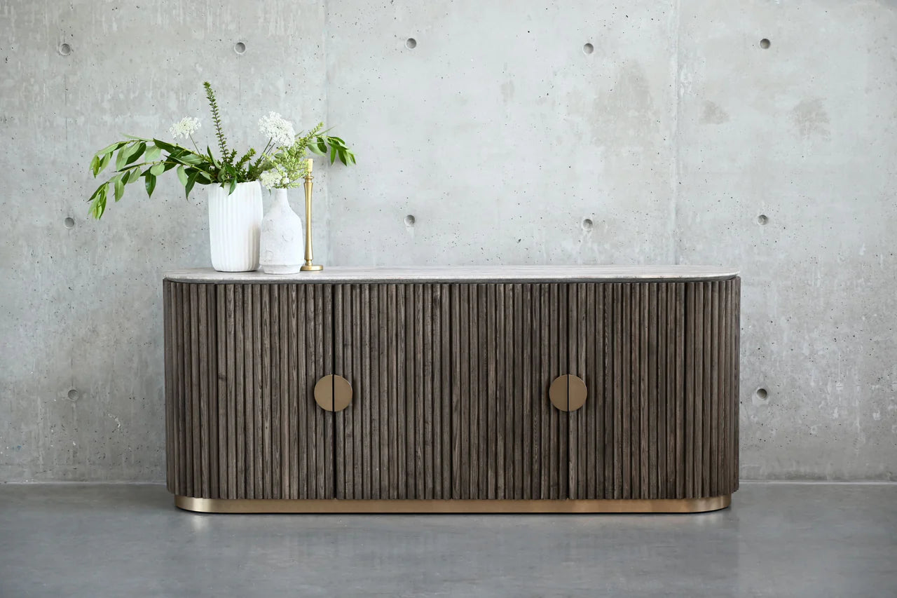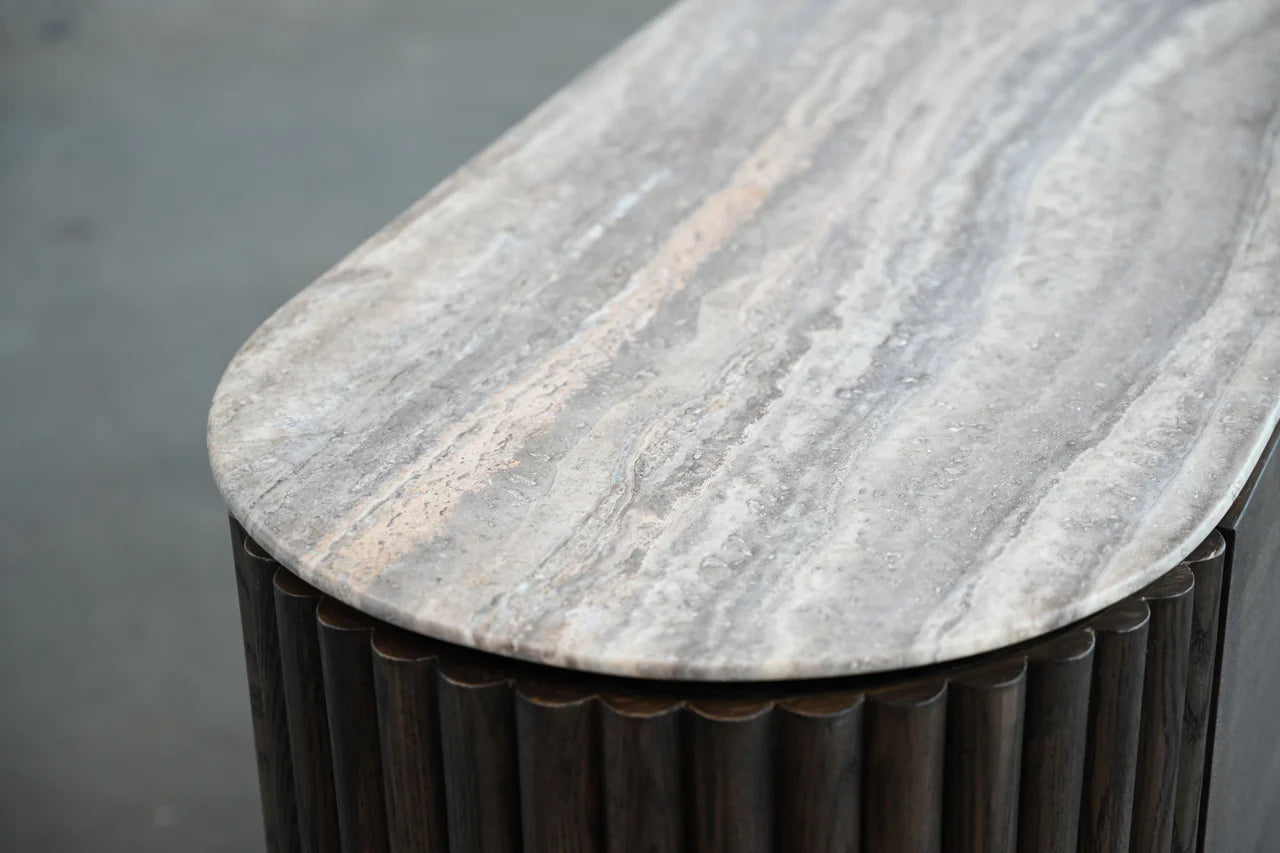 Introducing the Koii Collection, where elegance meets modern design. With its stunning silver-grey travertine marble top, this sideboard effortlessly enhances any space. Beautifully complemented by its fluted body and finished in an oiled ebony ash, Its rounded edges add a touch of softness, inviting warmth and intimacy to your gatherings.