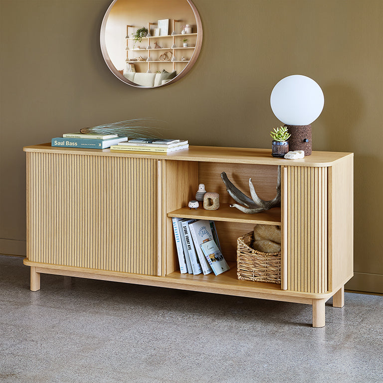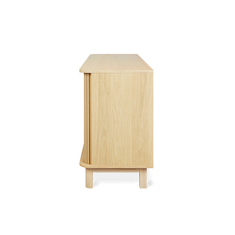 Stylishly reveal or conceal with Ledger, a contemporary storage design that showcases gorgeous tambour wood sliding doors, elegant proportions and skilled craftsmanship. Whether you’re looking for a clever solution to conceal clutter or an attractive way to display objects and collectibles, Ledger provides the answer. The tambour doors, which open smoothly into the back of the cabinet, prove that beautiful form follows function, displaying a simplicity of design engineering without the use of hardware and fasteners.