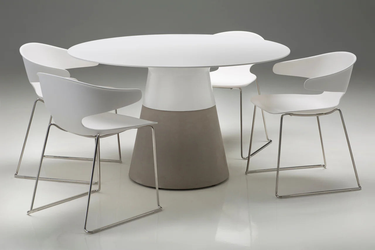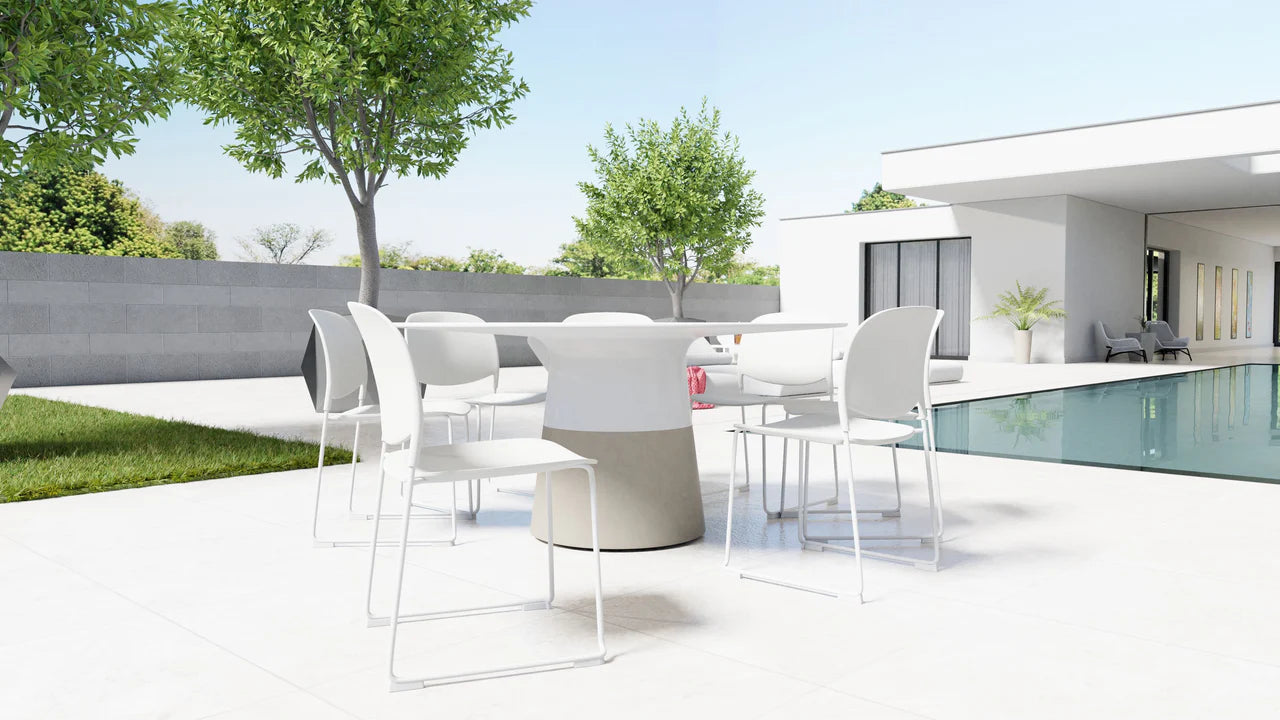 The Maldives Table Series is beautifully crafted with a solid surface table top that can be left out year-round. It is mold and mildew proof, stain resistant, UV resistant, chemical products resistant, anti-absorbent, and non-porous. The top is seamlessly blended to the sturdy concrete polymer base, which has its own built-in leveling feet that are perfect for all those random outdoor surfaces.