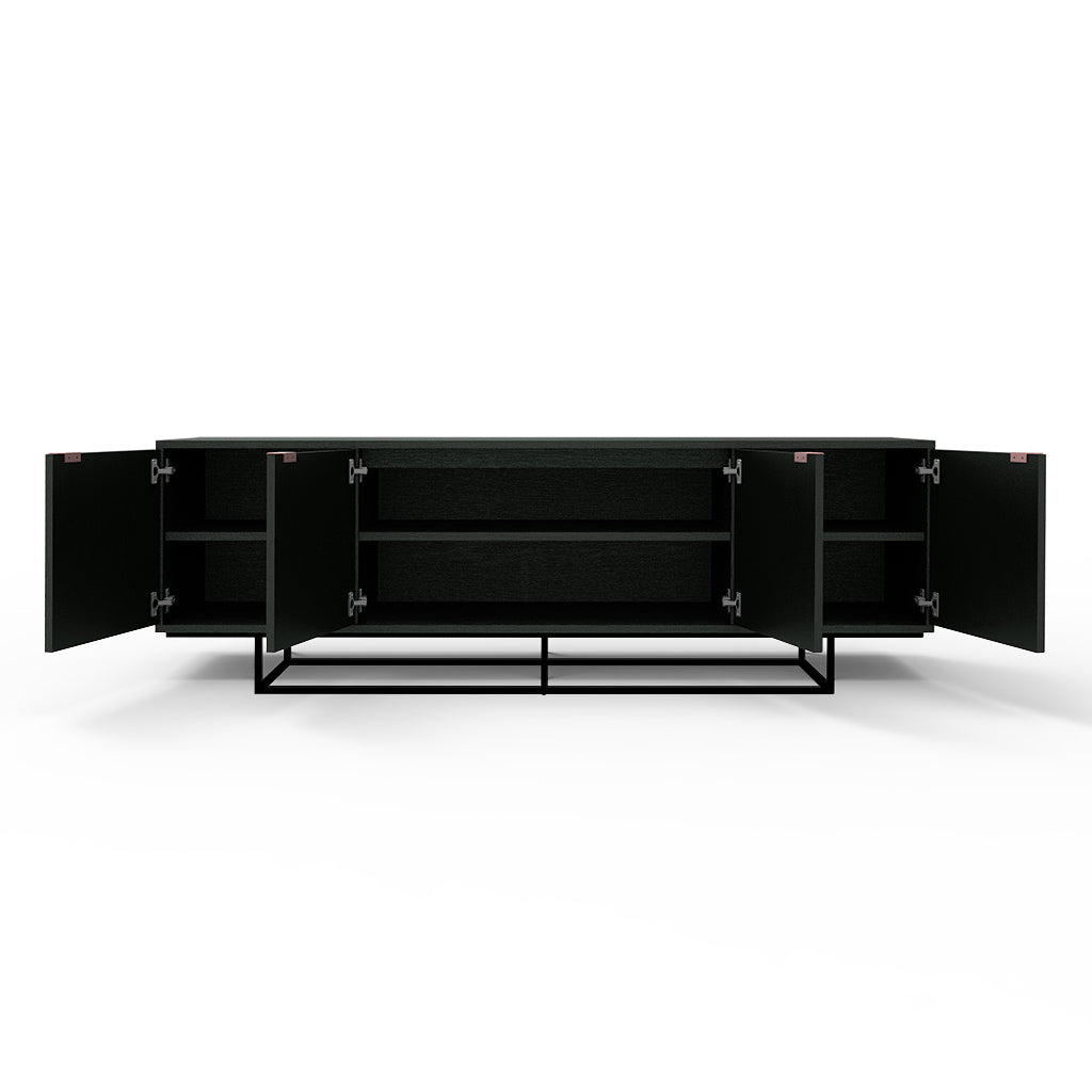 The Myles Credenza combines subtle details and craftsmanship to create a storage design that exudes simple sophistication. Rose gold handles contrast dark stained, chevron-patterned oak faces. A recessed, slender steel base with black, powder-coated finish creates an illusion of weightlessness. Adjustable shelves provide plenty of efficient storage space. Part of the Myles Storage Series, this credenza matches perfectly with the Myles Media Stand and End Table.