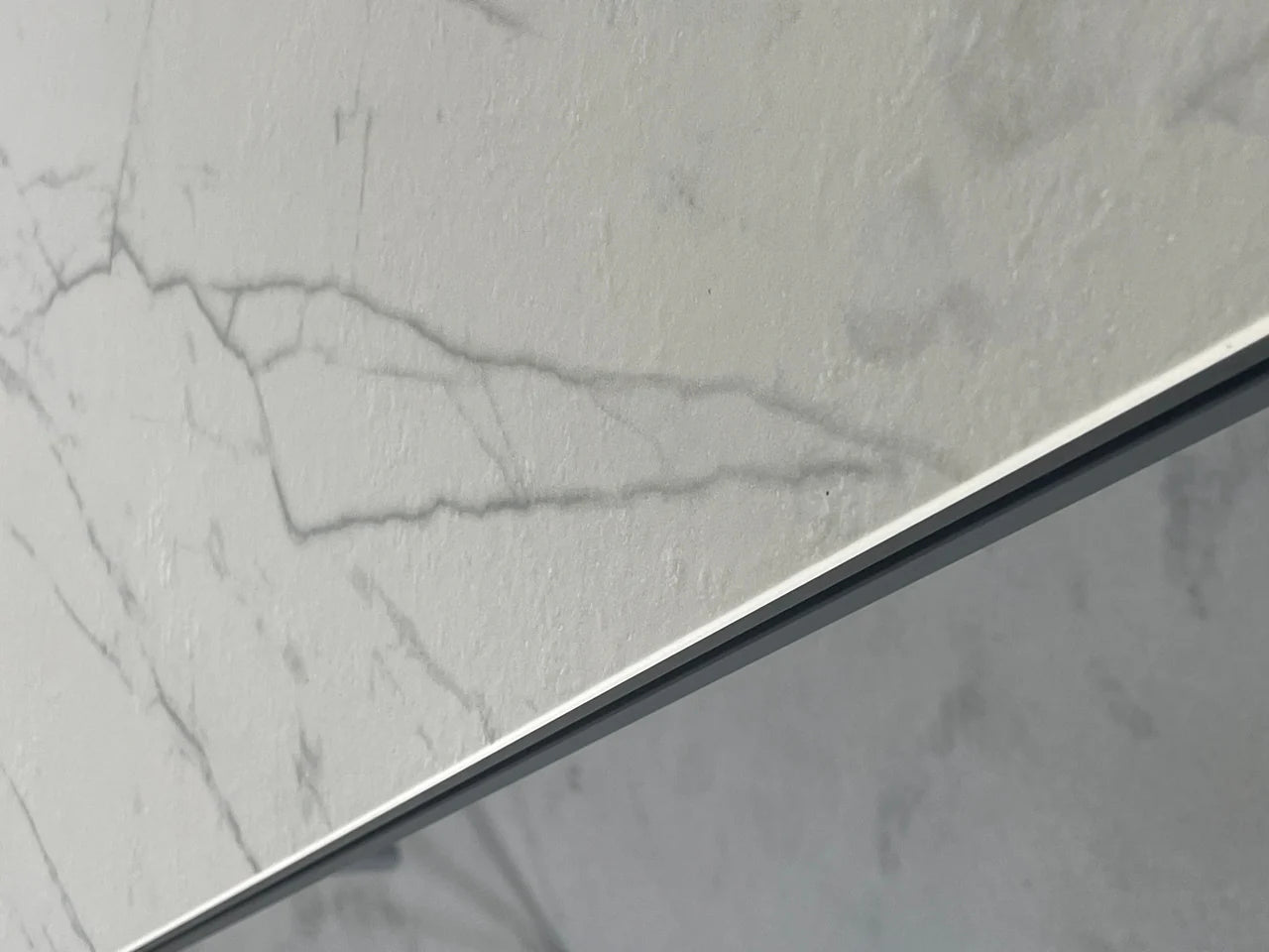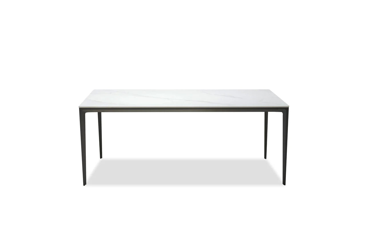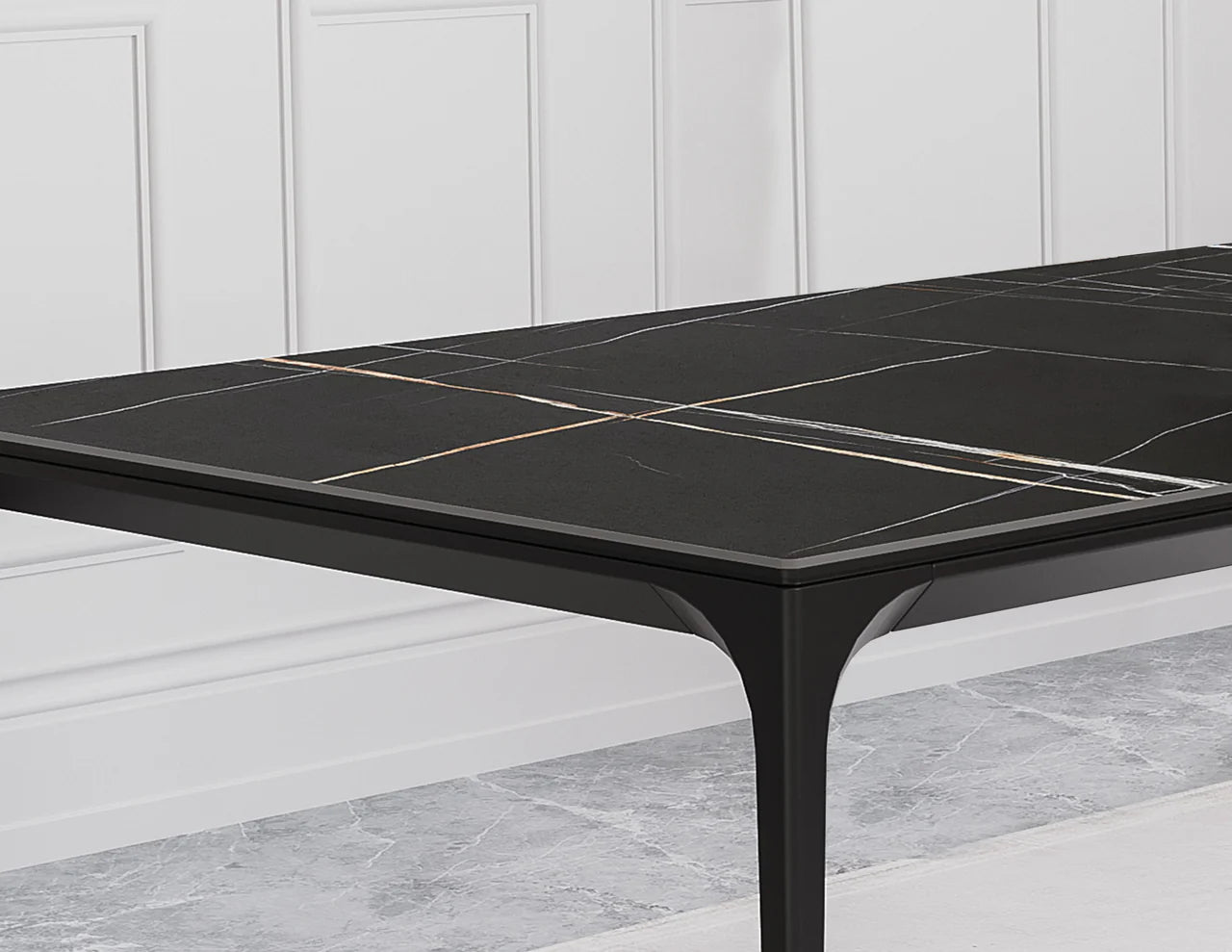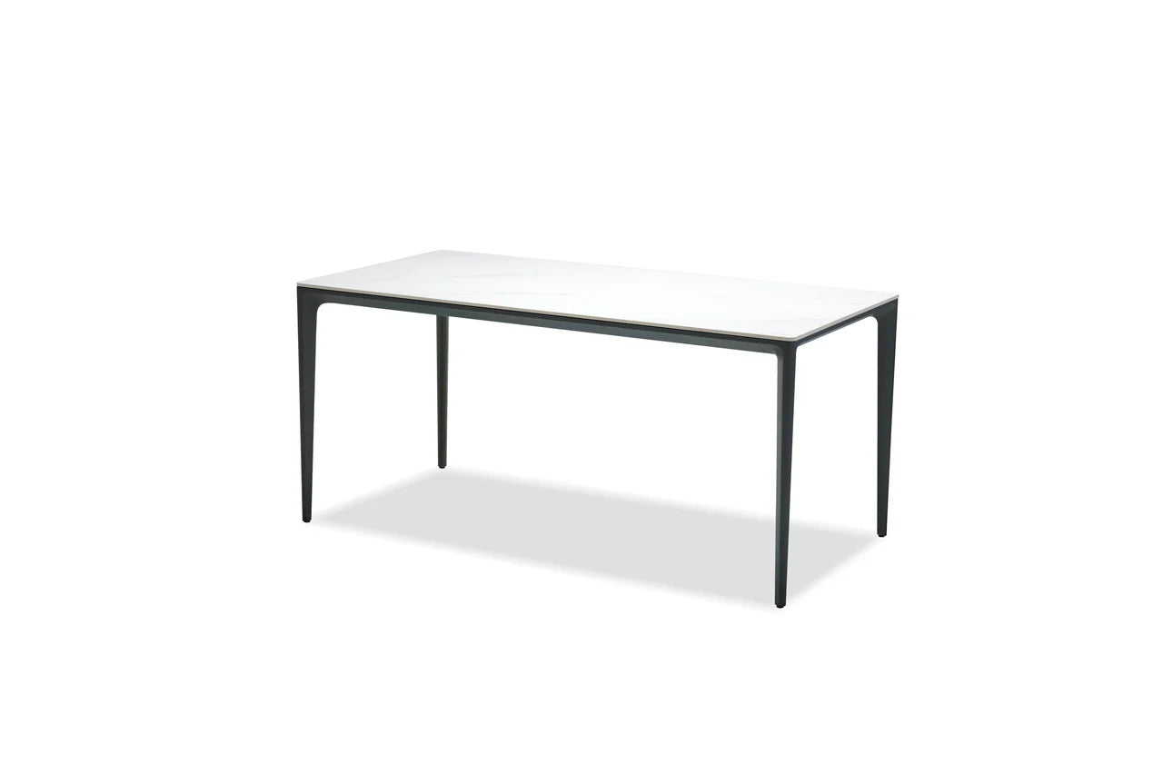 The Capri Dining Table showcases a sophisticated design with a black powder-coated steel base. It features a ceramic top, offering both style and durability for everyday dining use. This table can be suitable for indoor/outdoor use and comes in a stylish white carrera color or safari black.