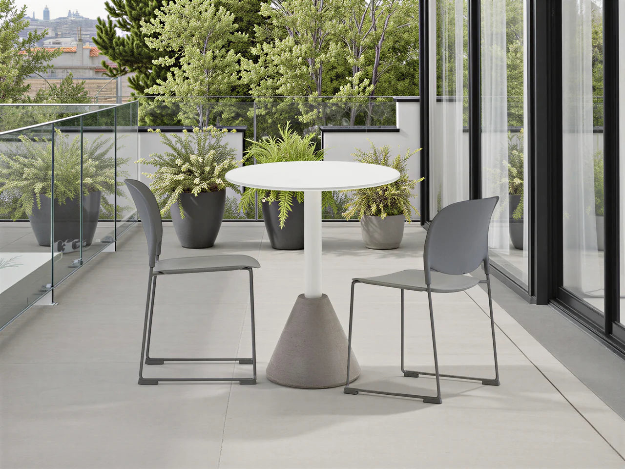 Modern and minimal with the simplest of materials combined makes the perfect bistro table. Constructed with a resin-covered concrete board top, a white powder-coated steel pedestal, and a heavy-duty concrete polymer base, this bistro table can be used indoors or outdoors and be left out year-round. Perfect for balconies and small spaces.