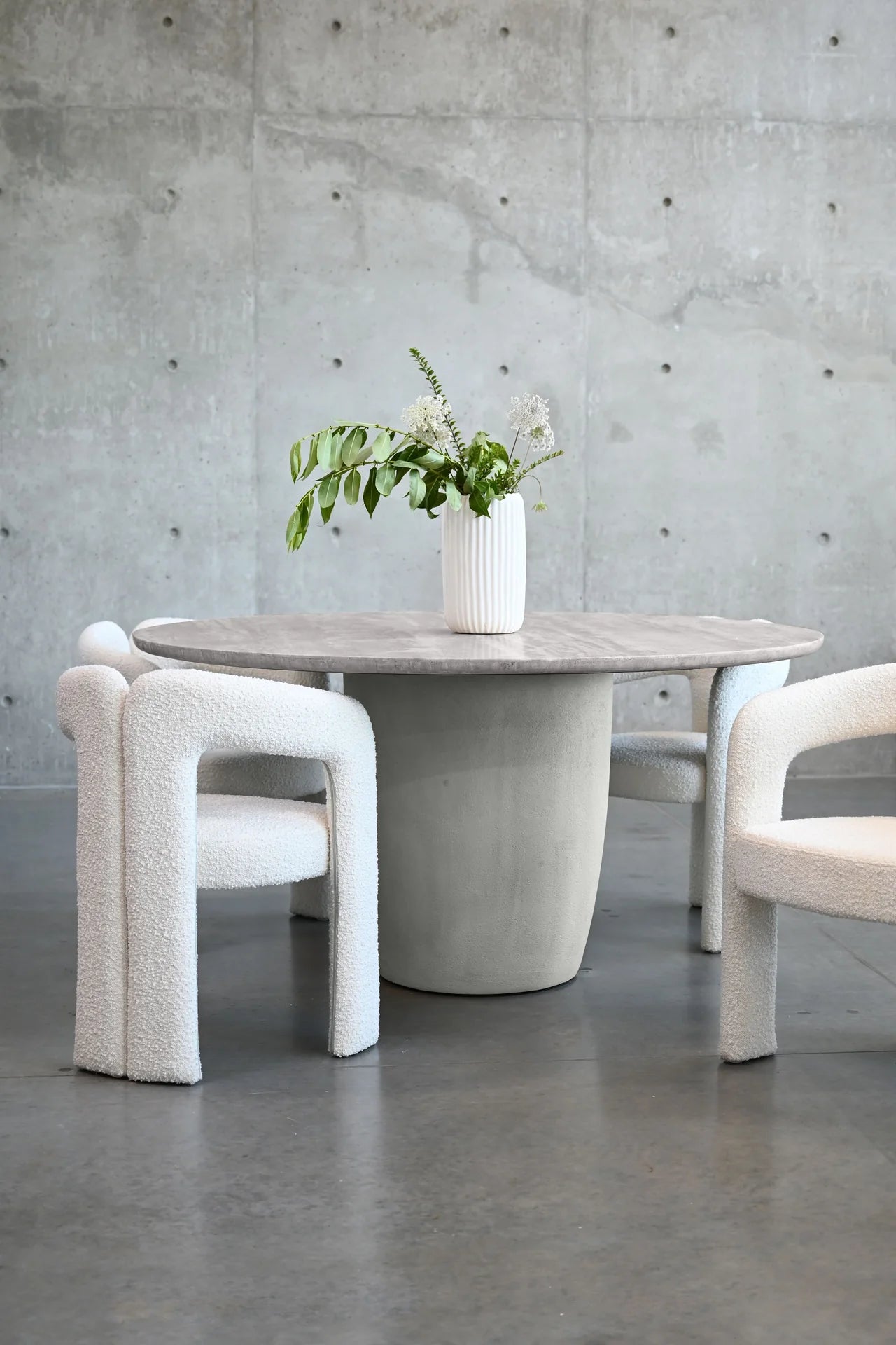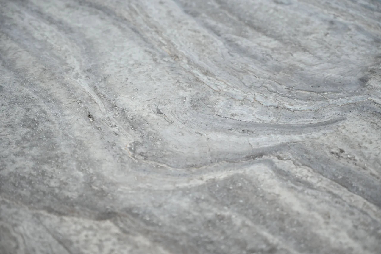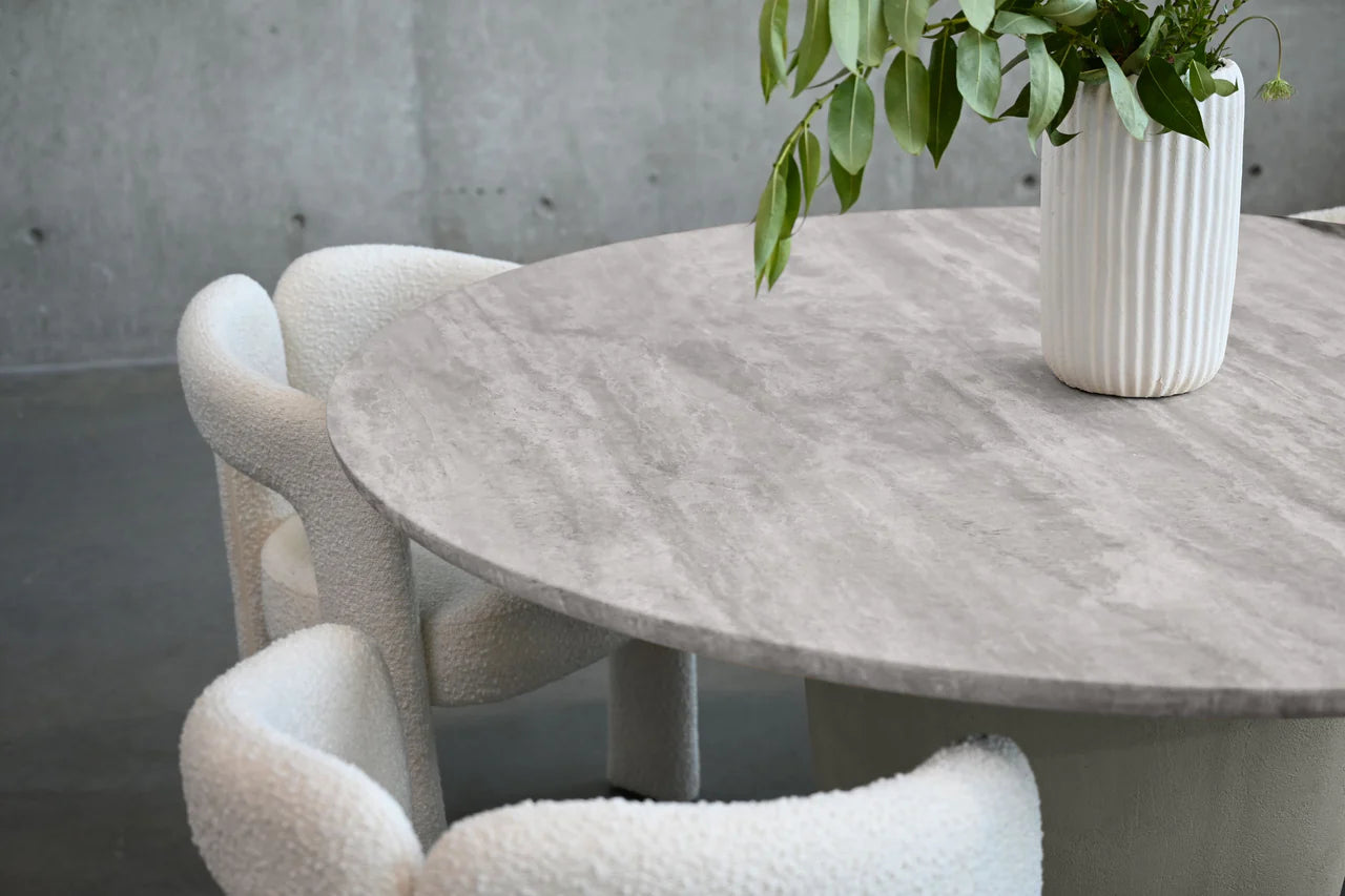Introducing the Erden Dining Table: where elegance meets modern design. With its stunning, silver-grey travertine marble top, this table effortlessly enhances any dining space. The rounded top adds a touch of softness, inviting warmth and intimacy to your gatherings. The minimal base is made from micro cement in a silver taupe which complements the luxurious marble surface.