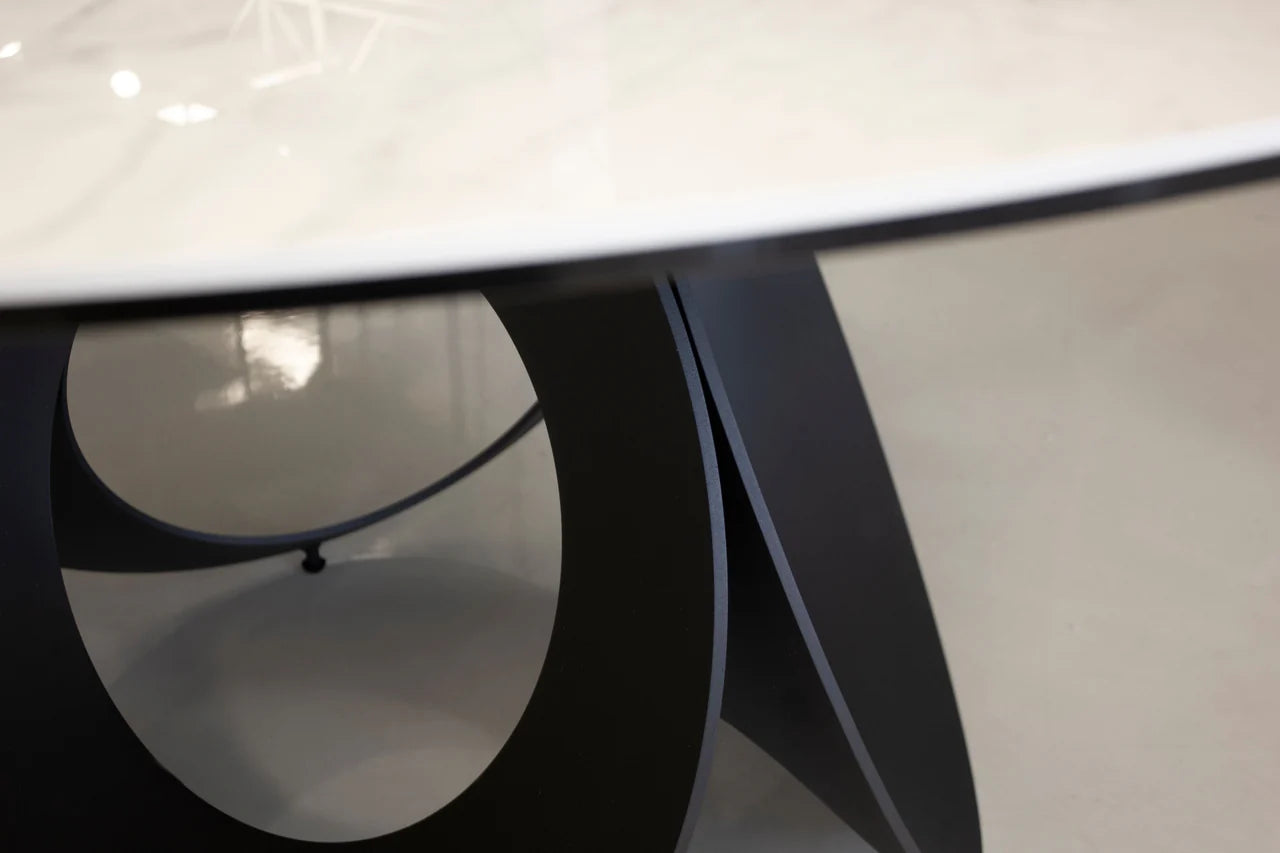 The Optic Dining Table is the ultimate high-gloss ceramic top round dining table. Its unique base features three connected rings, built to last with a black powder-coated steel frame/base and a scratch and stain resistant top.