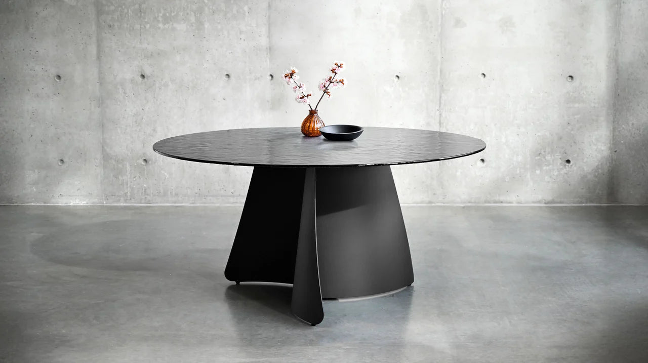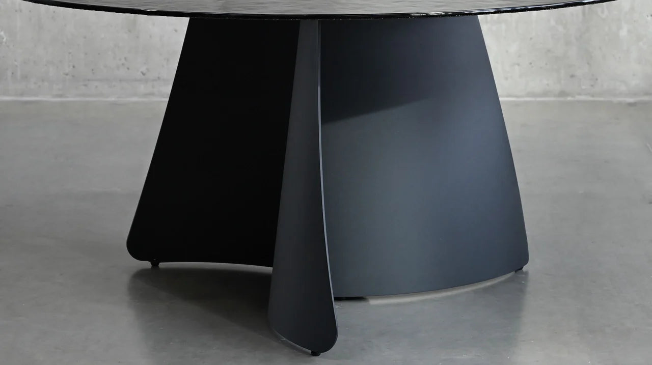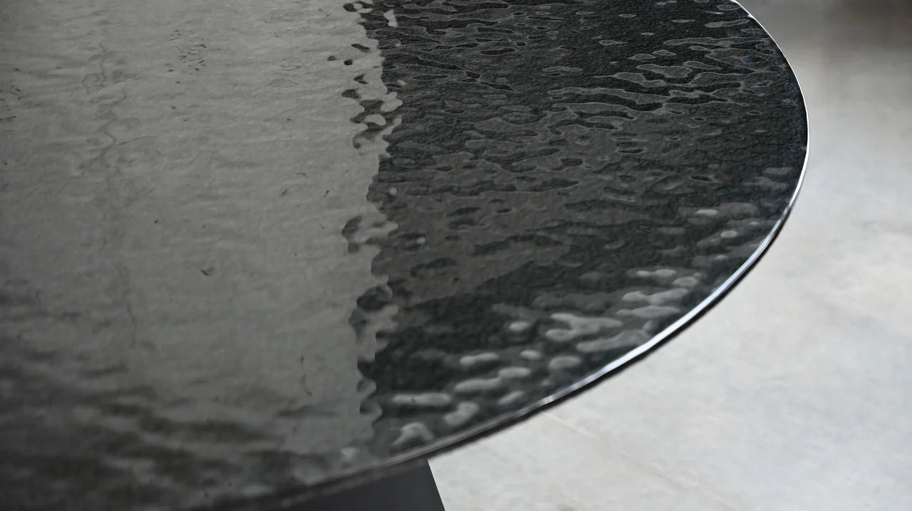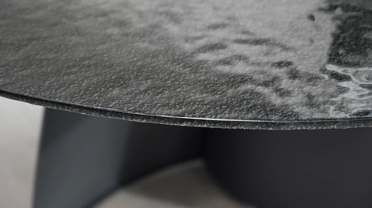 The Orca Dining Table is a sleek and contemporary piece that adds a touch of elegance to any dining room. The black base provides a strong foundation for the stunning modern melt glass top--which resembles a body of water on a rainy day--creating a unique and eye-catching focal point for any space. This table seats 6-8.
