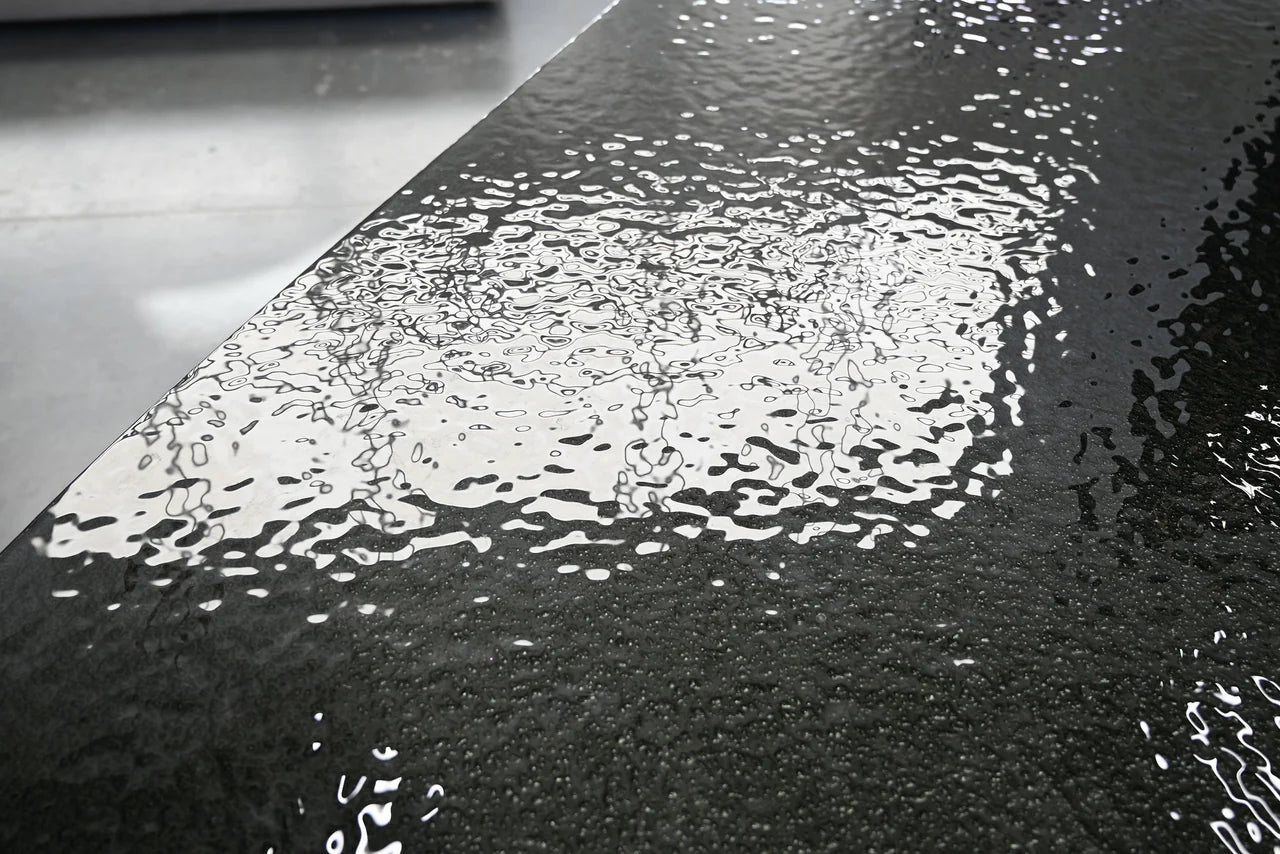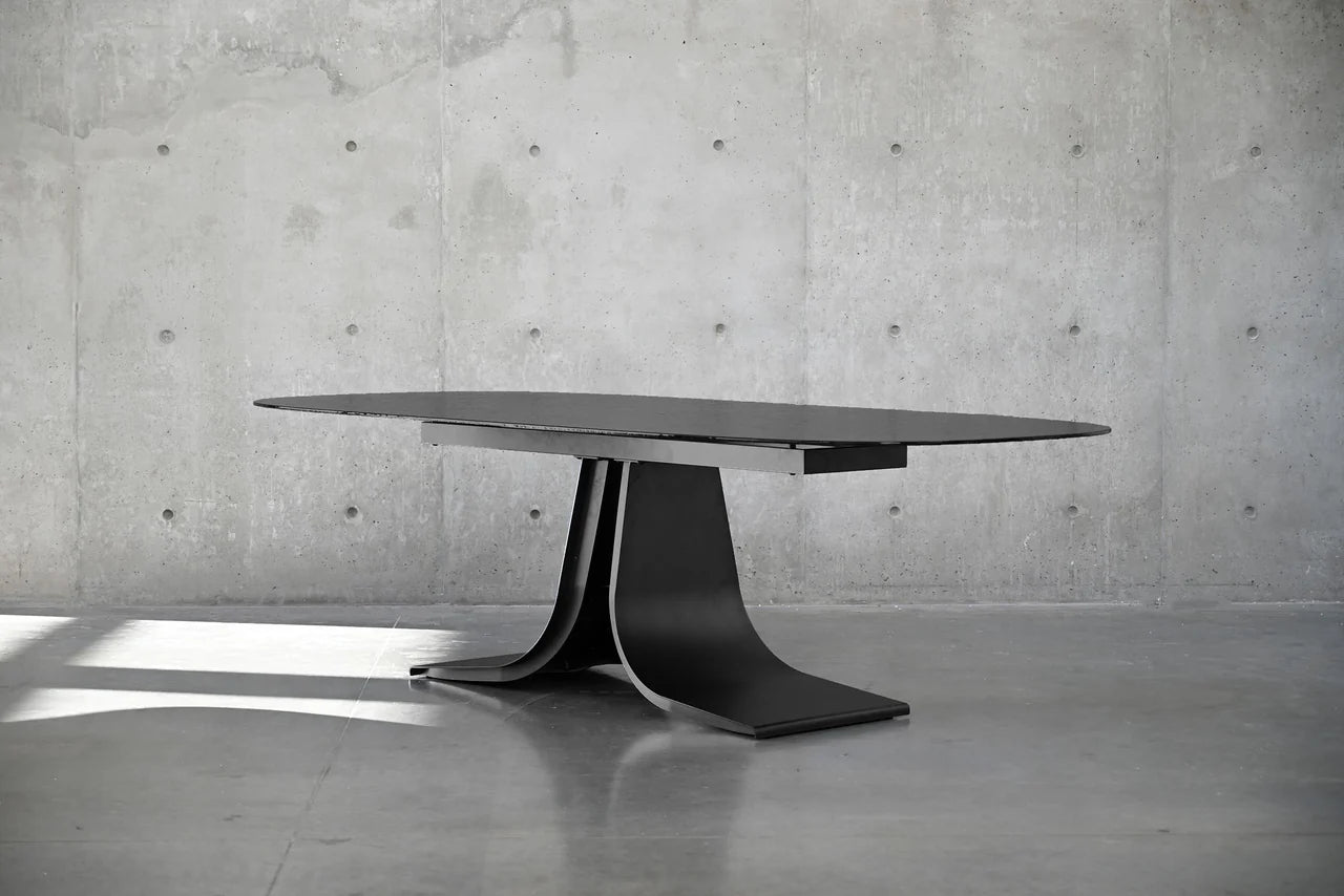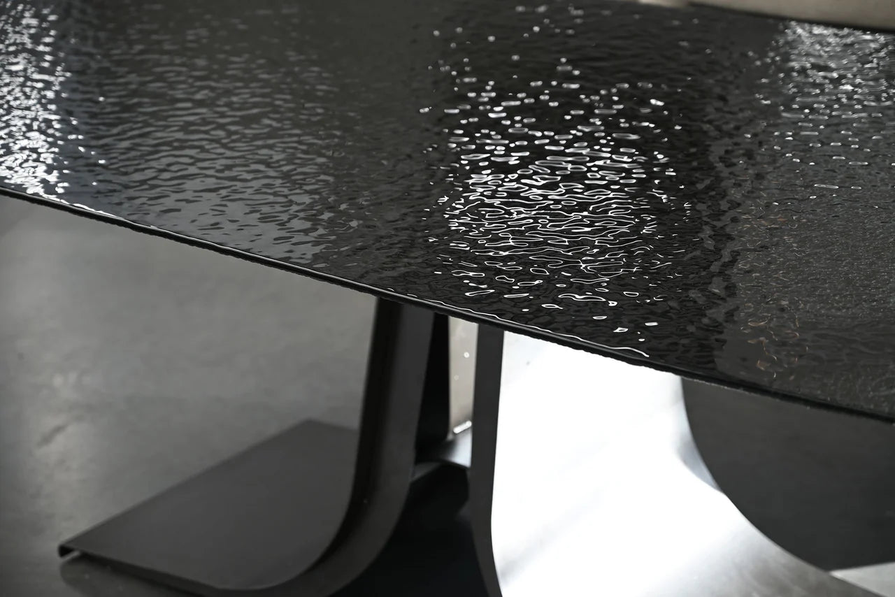 The Ponza Dining Table is a sleek and contemporary piece that adds a touch of elegance to any dining room. The black base provides a strong foundation for the stunning modern melt glass top, which resembles a body of water on a rainy day, creating a unique and eye-catching focal point for any space.