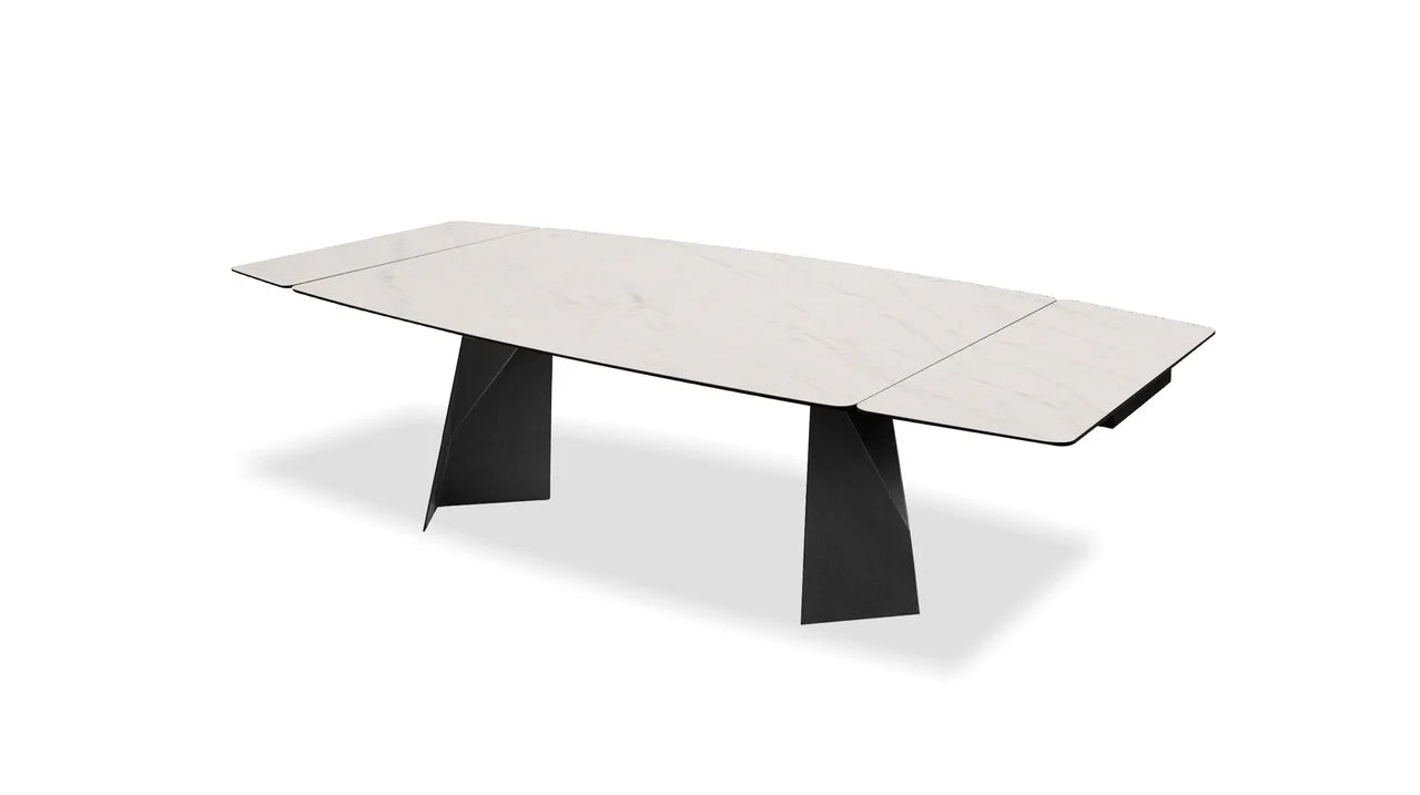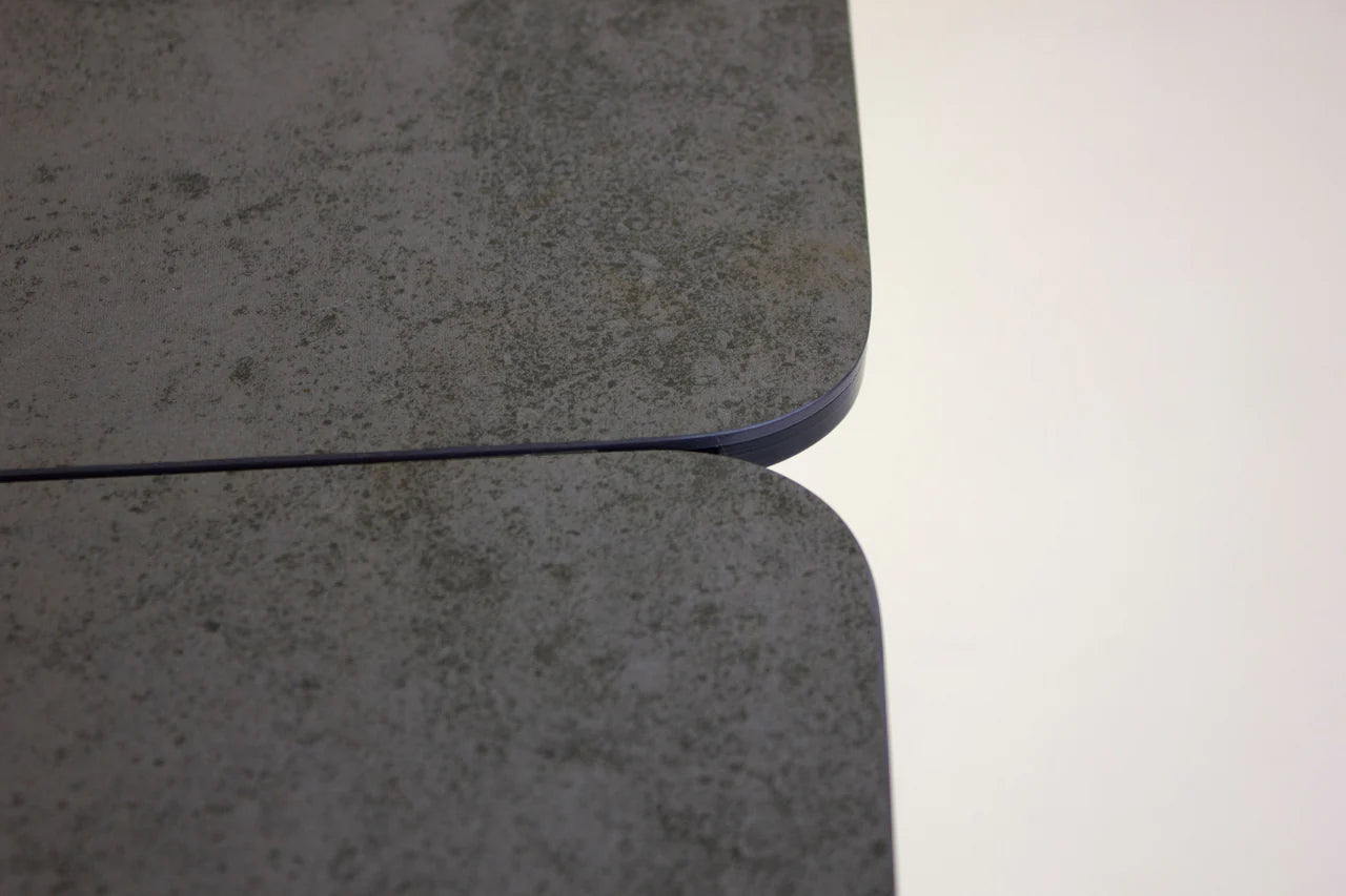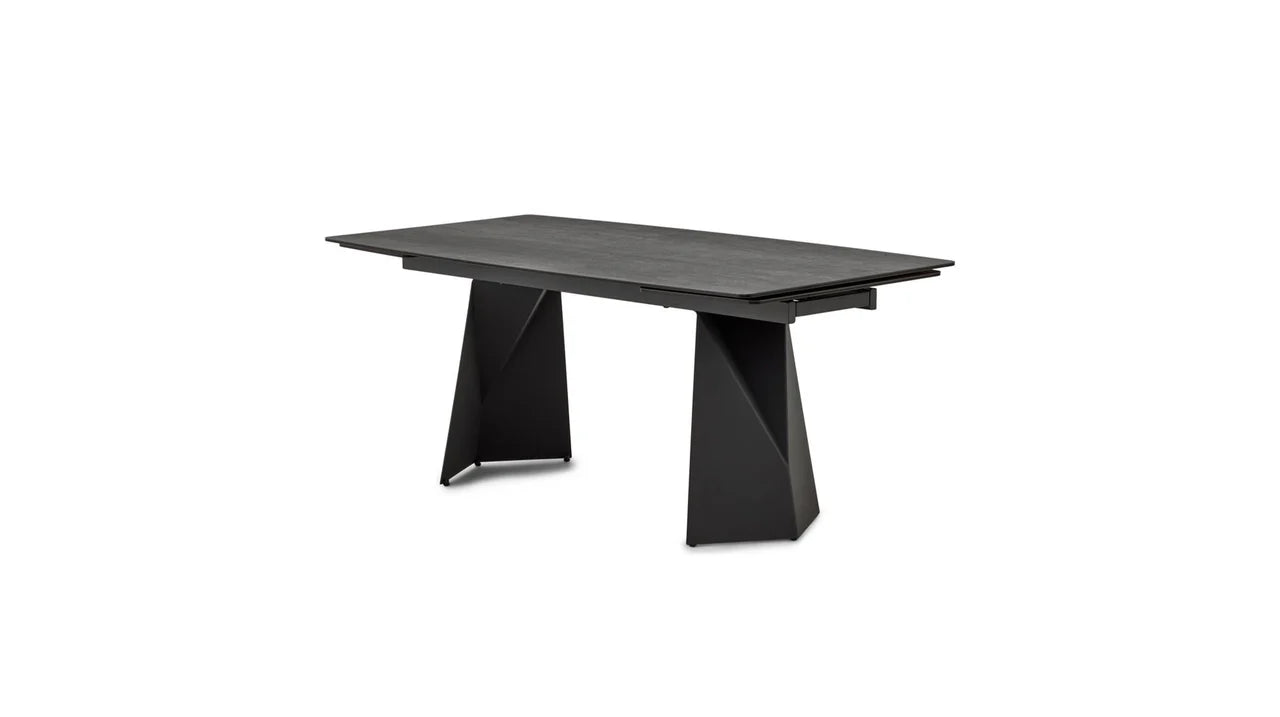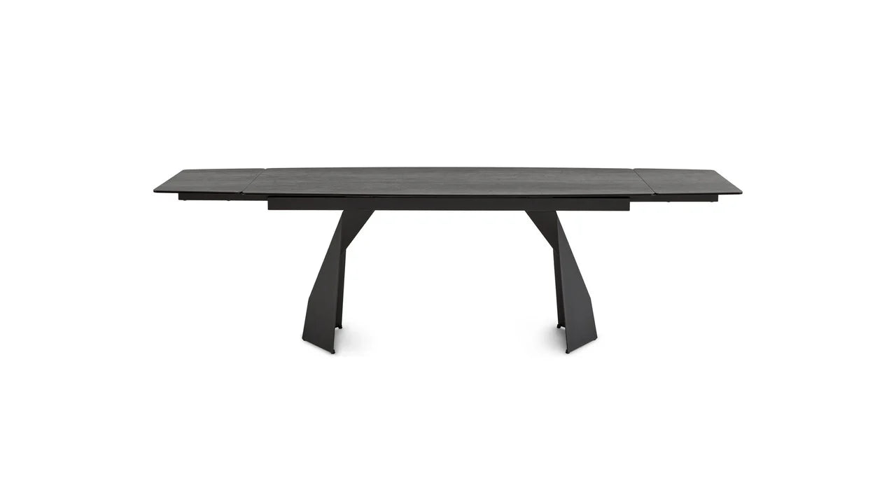 The Prism Dining Table has two manual extending leaves that are self-storing under the table. It is made with a charcoal powder-coated steel base and the top is made from ceramic and glass that is laminated together. The ceramic has a matte textured finish and looks like real slate stone. The ceramic is scratch-proof and stain-proof and is easily maintained with soap and water. The top also features a gentle curved shape.
