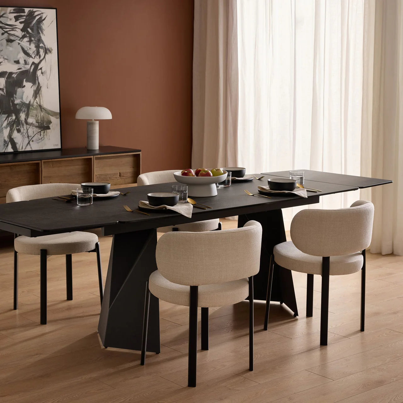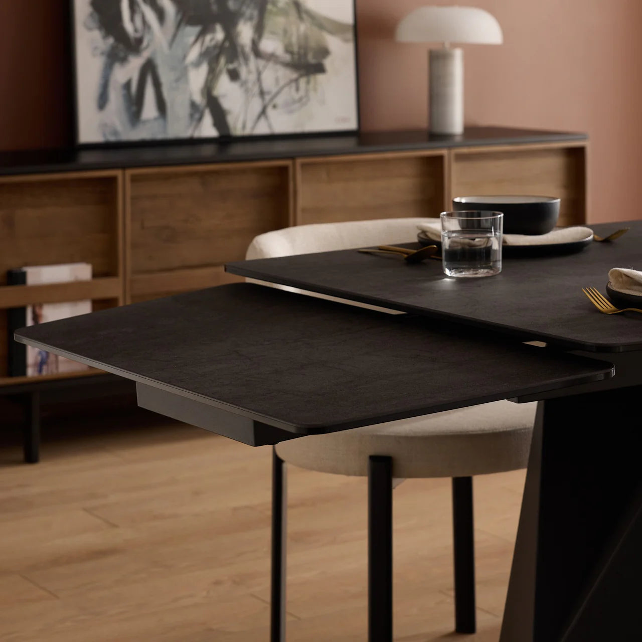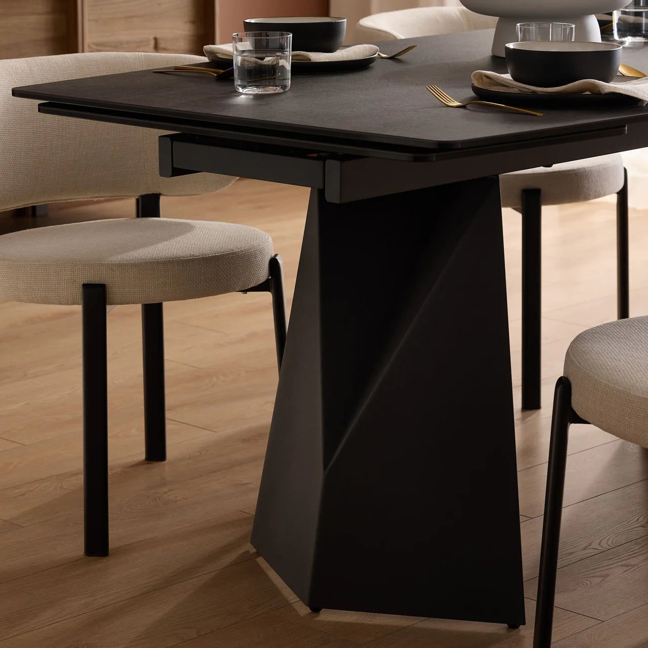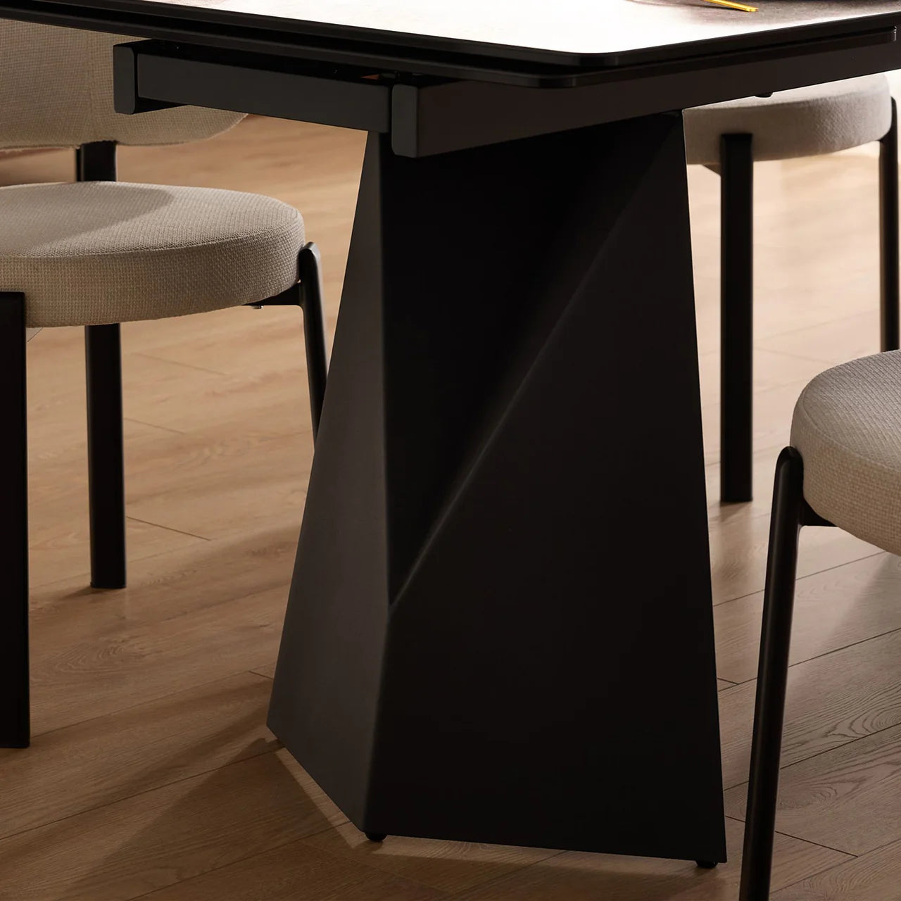 The Prism Dining Table has two manual extending leaves that are self-storing under the table. It is made with a charcoal powder-coated steel base and the top is made from ceramic and glass that is laminated together. The ceramic has a matte textured finish and looks like real slate stone. The ceramic is scratch-proof and stain-proof and is easily maintained with soap and water. The top also features a gentle curved shape.