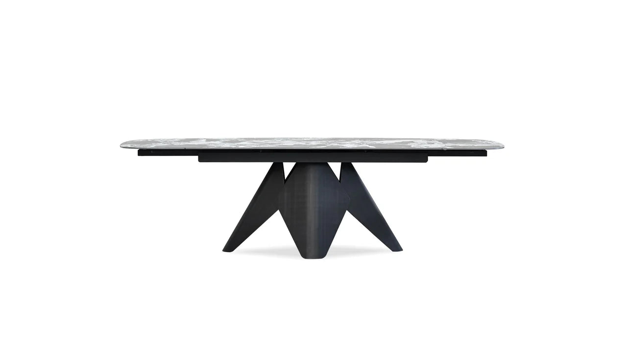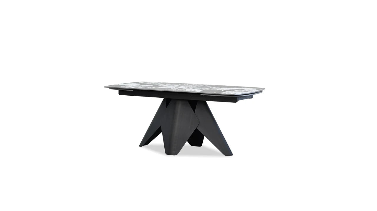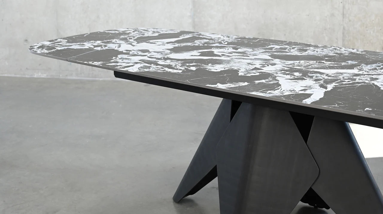 The Taji Extension Dining Table is a sophisticated piece designed to enhance your dining space. Make it larger for dinner parties with the extendable leaves. It boasts a tourmaline black sintered stone top, which offers a sleek and durable surface for meals and gatherings. The table's foundation is a sturdy matte black powder-coated steel base, providing both stability and a contemporary aesthetic.