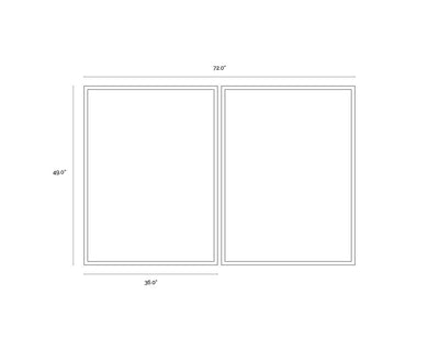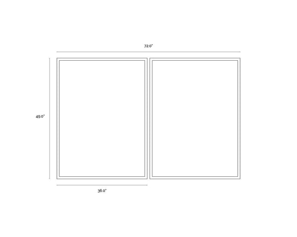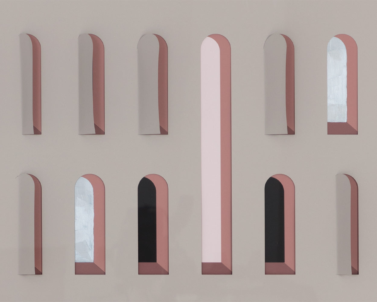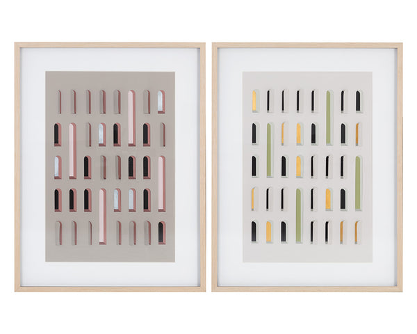 This diptych likes to stay open. Featuring cut-out paper doors facing opposite directions on each panel for a mirrored effect. One half of the artwork features a warm palette with taupe, terracotta and soft pink colours while the other half is a fresh hue of light greige and green to complement the gold leaf accents behind some cut-out doors. Finished with natural wood frames.