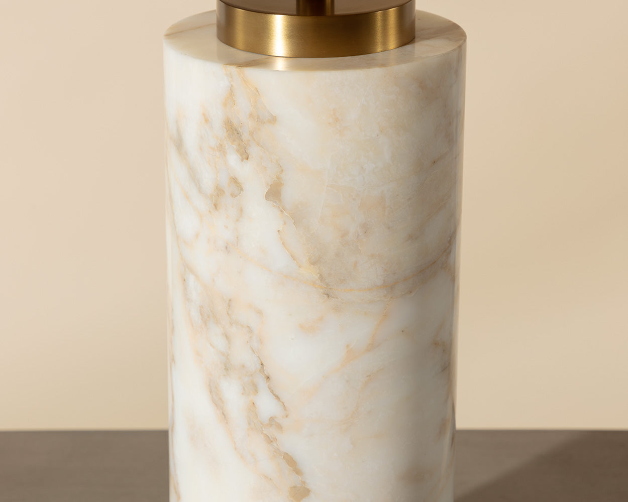The Cilla Table Lamp features an opulent combination of luxe mixed materials. A cylindrical base of rich Italian marble highlights varying colour tones and organic veining patterns, giving each lamp a distinct character. Topped with a tapered metal shade in a brushed gold finish that beautifully complements the modern design and enhances the lamp's pleasant glow.
