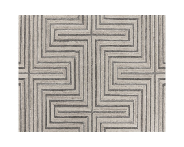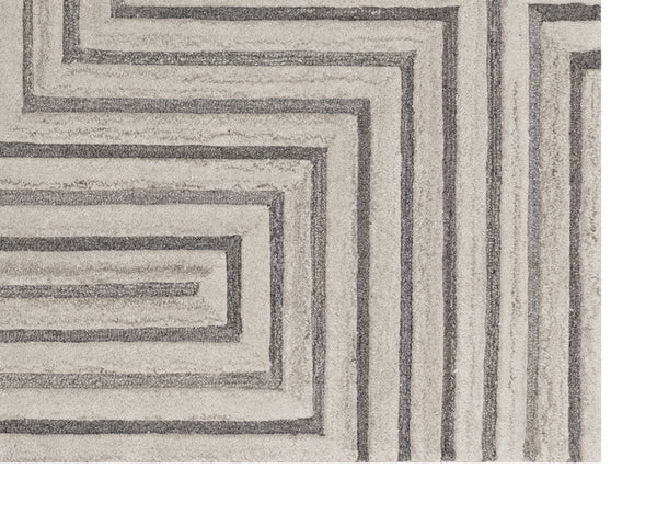Bold lines create a maze-like pattern on this hand-tufted rug made by skilled local artisans. With its wool composition in complementing beige and grey hues, this rug is sure to impress. Available in four sizes.