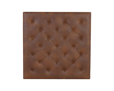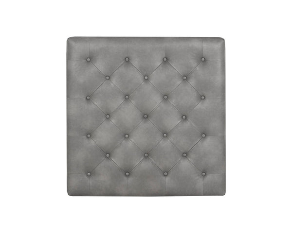 This large square ottoman exudes elegant and transitional flair. Features button tufting with an exposed x-base frame. Stocked in bravo metal leather with a matte black powder coated metal frame. Can be used as a coffee table or as extra seating in residential and commercial spaces.