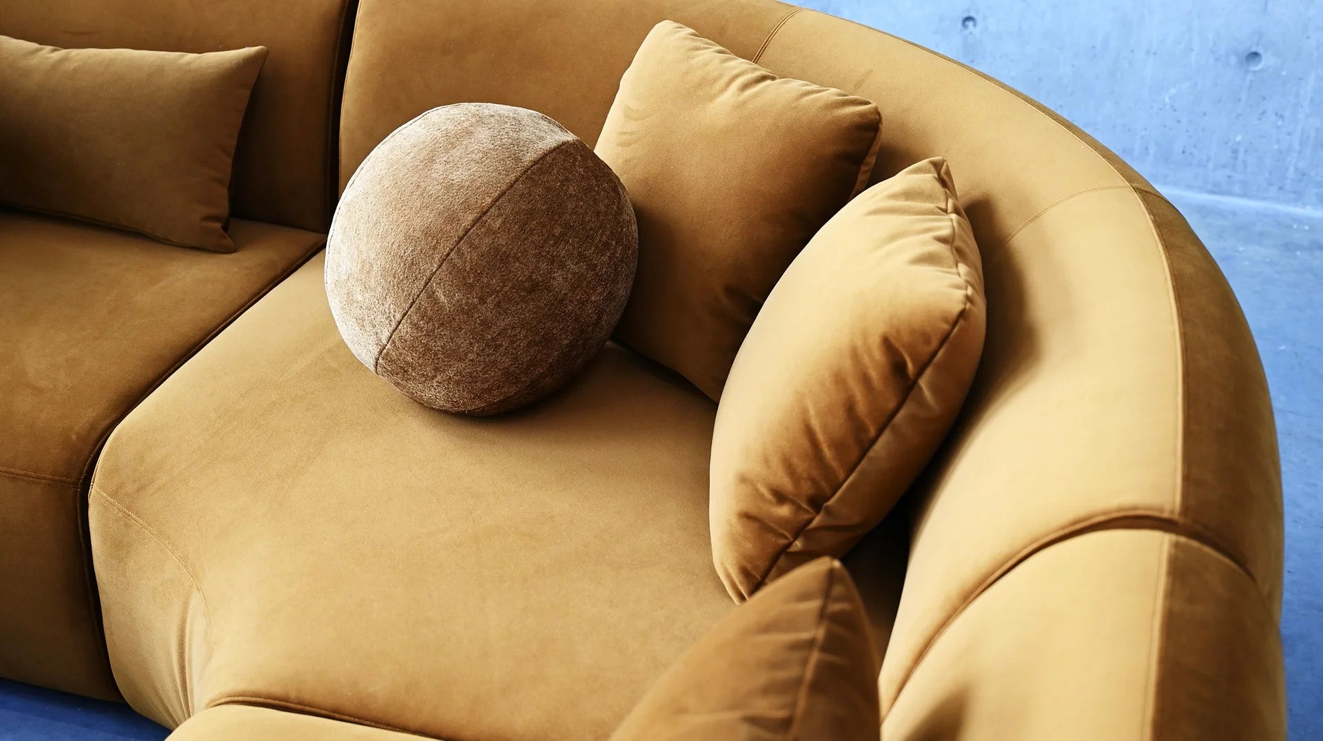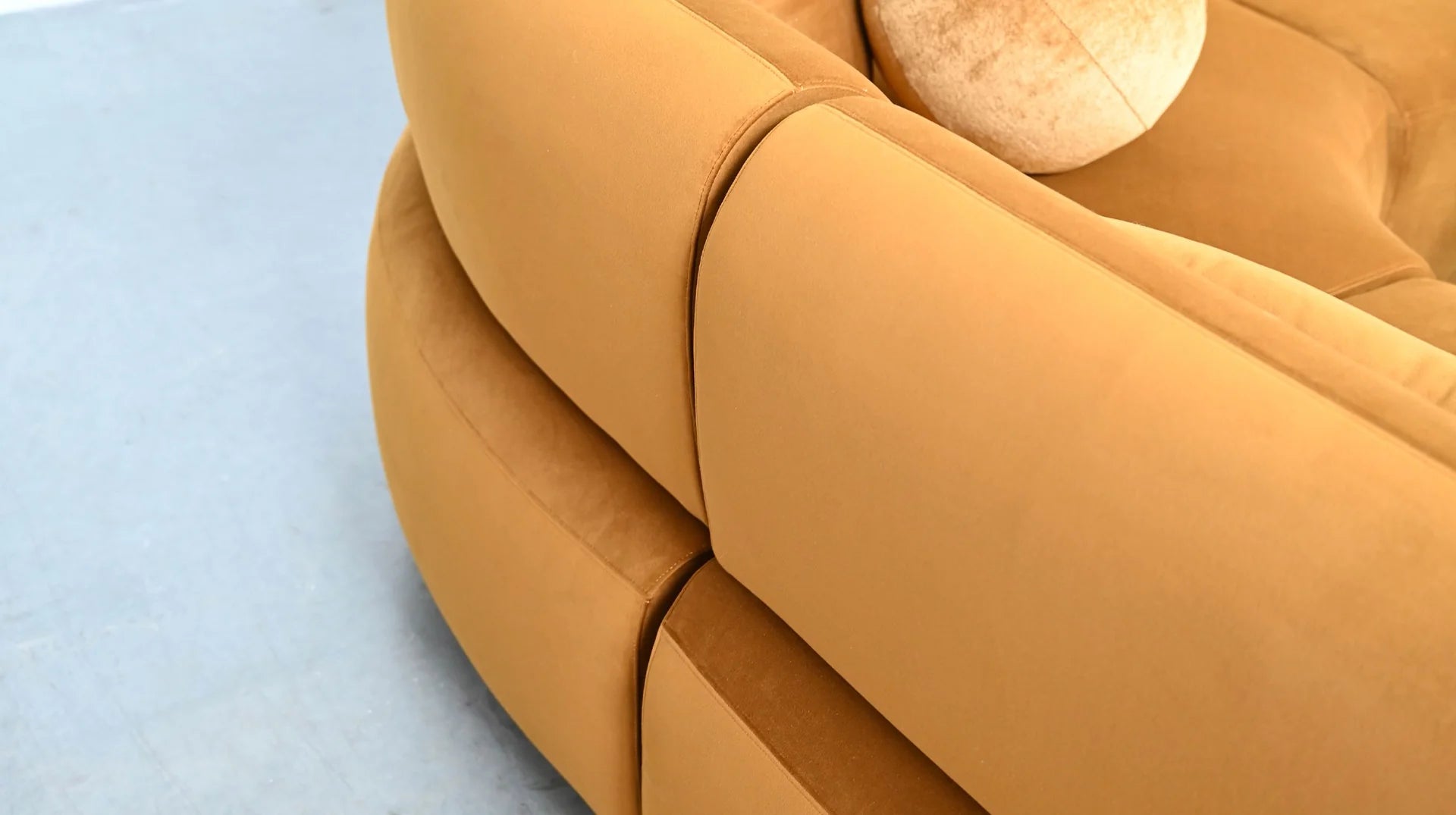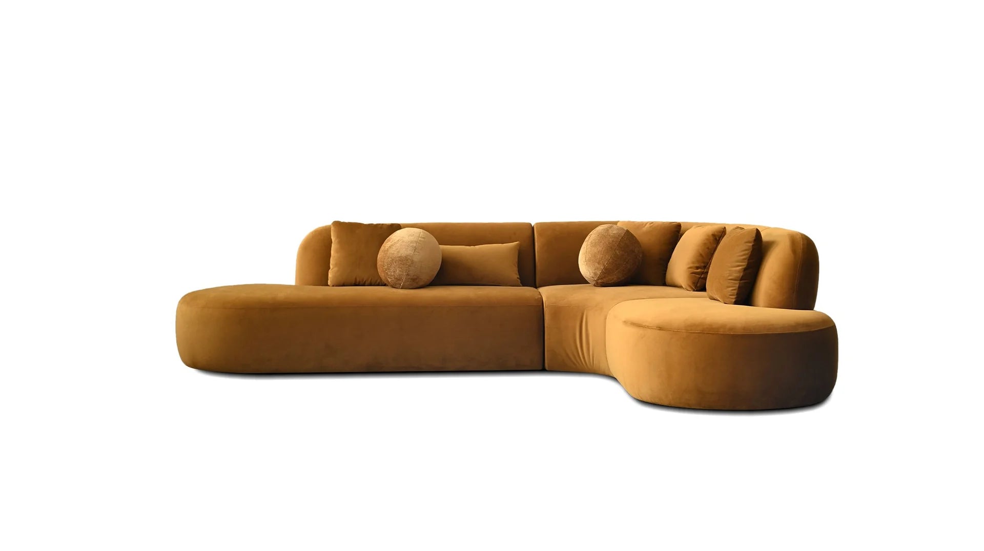 The Itza 3-Piece Sectional features a vibrant calendula velvet fabric that adds warmth and charm. Its playful design is highlighted by a gracefully curved body and backrests that create an inviting, relaxed vibe. The combination of square and round toss cushions enhance its casual, plush appearance.