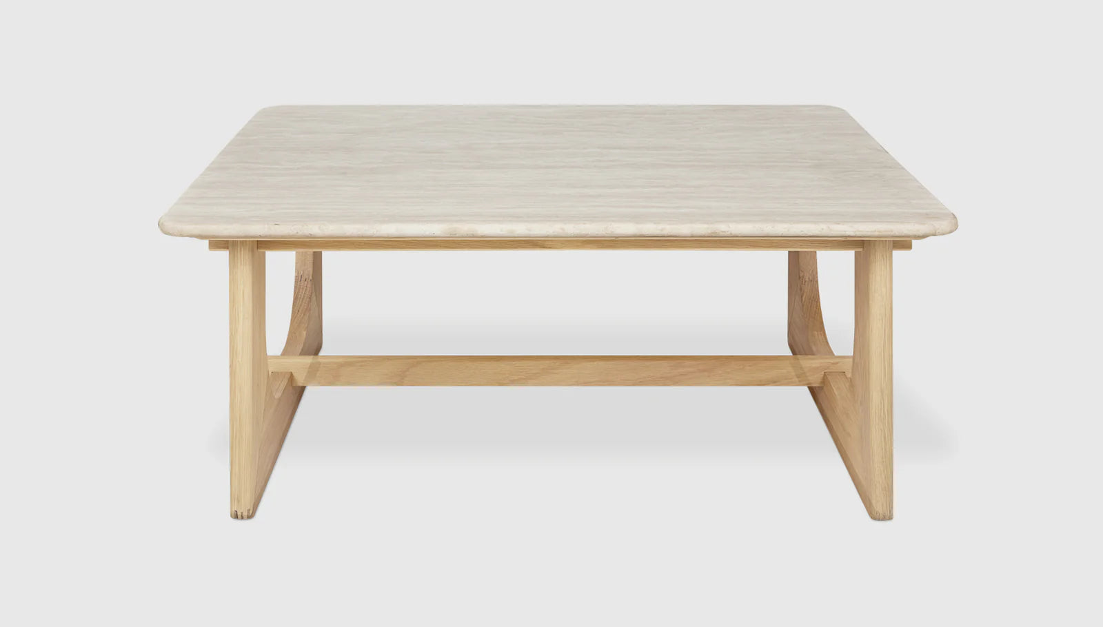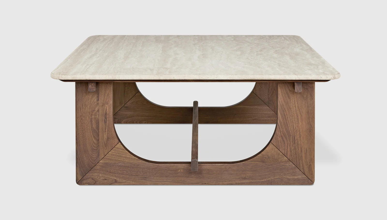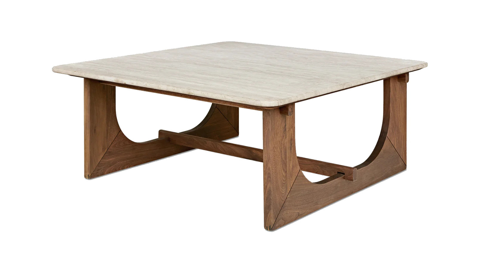The Portico Coffee Table showcases an alluring travertine slab surface and elegantly crafted solid wood base in Walnut or White Oak. The warm, natural travertine grain creates an organic beauty that is unique to each design, reinforced by gently curved corners. The Portico Coffee Table is available in square or rectangular size. Also available as an End Table.
