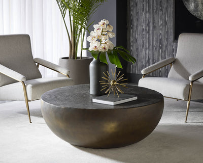 Add global flair to any living space with this unique coffee table. Handcrafted in India using antique bronze aluminum curved into a drum like shape. The etched tabletop adds extra character to complete the piece.