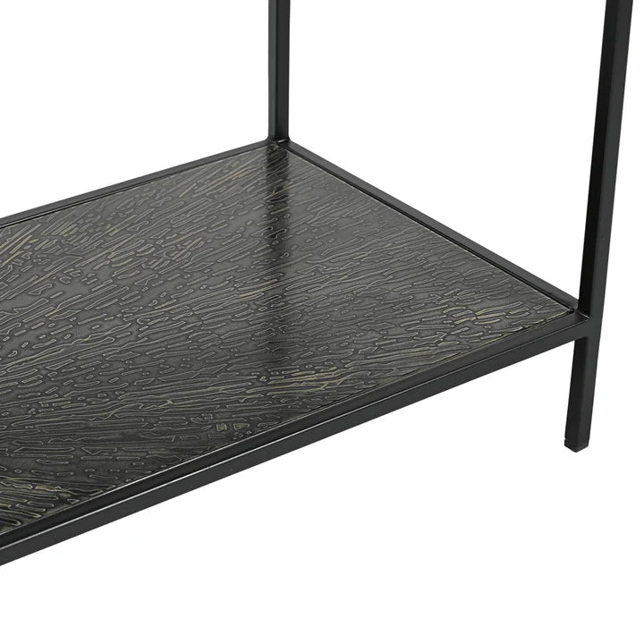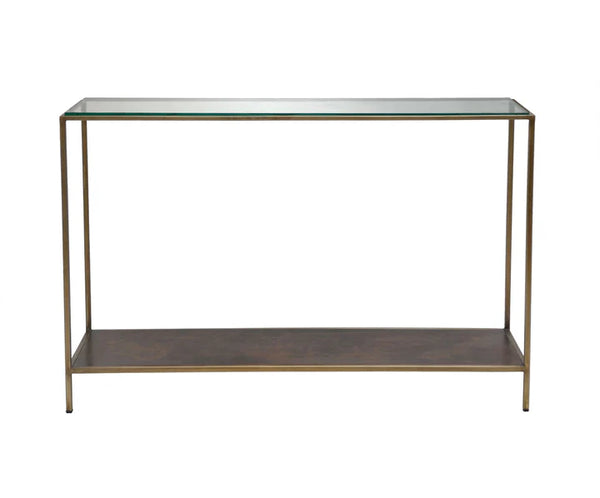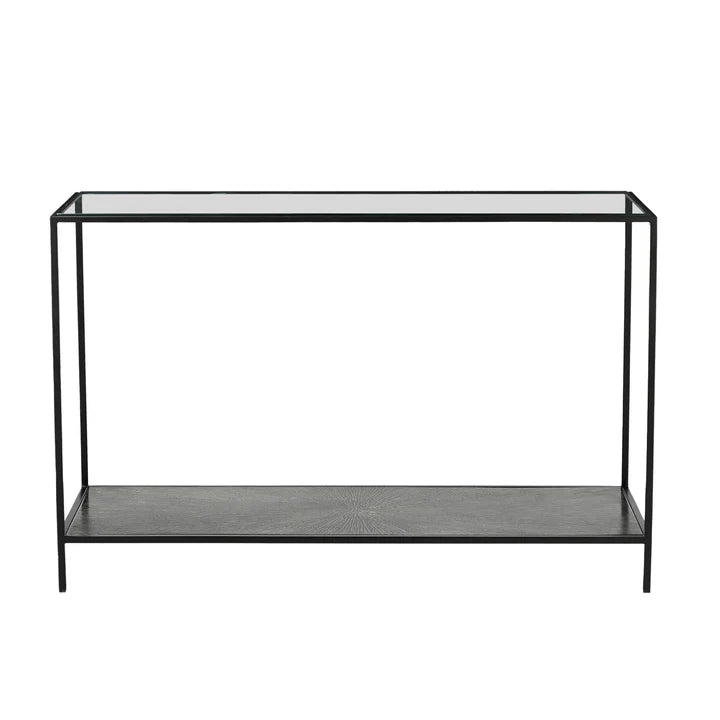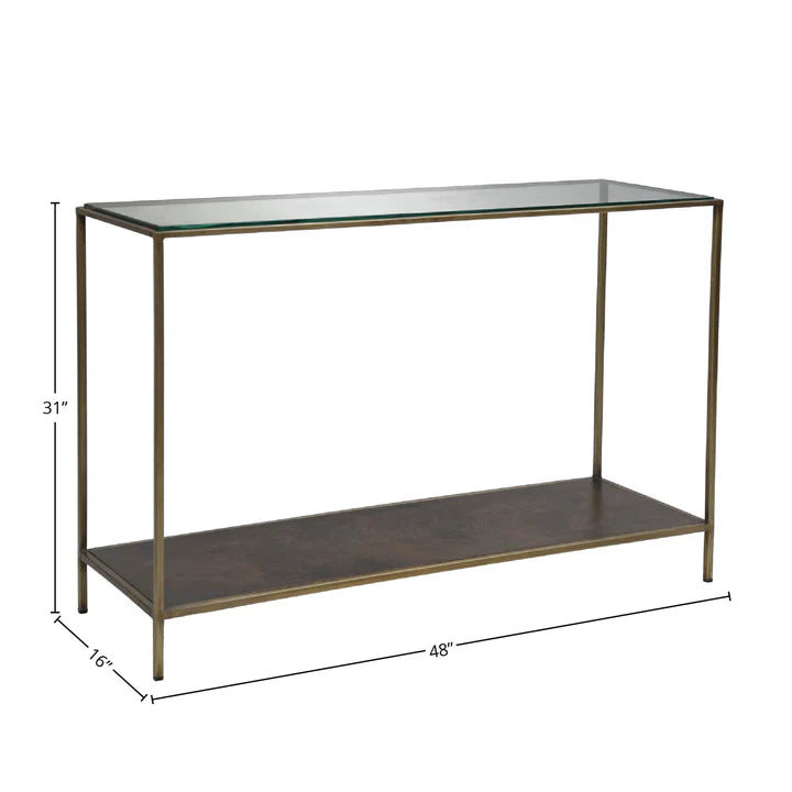 Designed to impress with clean lines and bold details, this console table brings a refined edge with its tempered glass surface and sleek black or bronze iron frame.