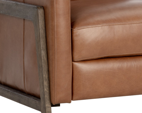 A handsome, modern recliner that will allow guests to sit back and relax. Features a comfortable seat in shalimar tobacco leather with a push back reclining mechanism. For added dimension, this recliner also features an exposed dark brown solid oak wood frame.