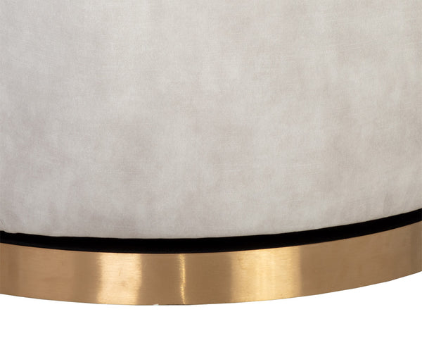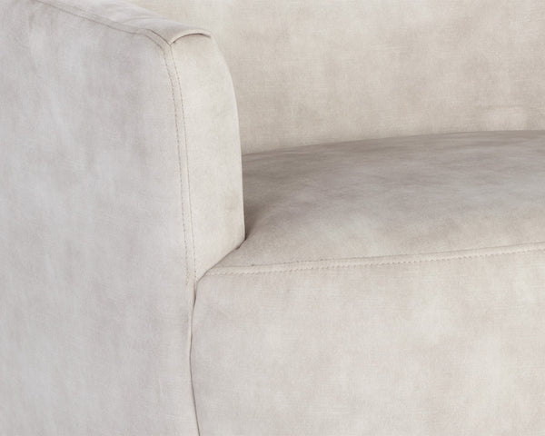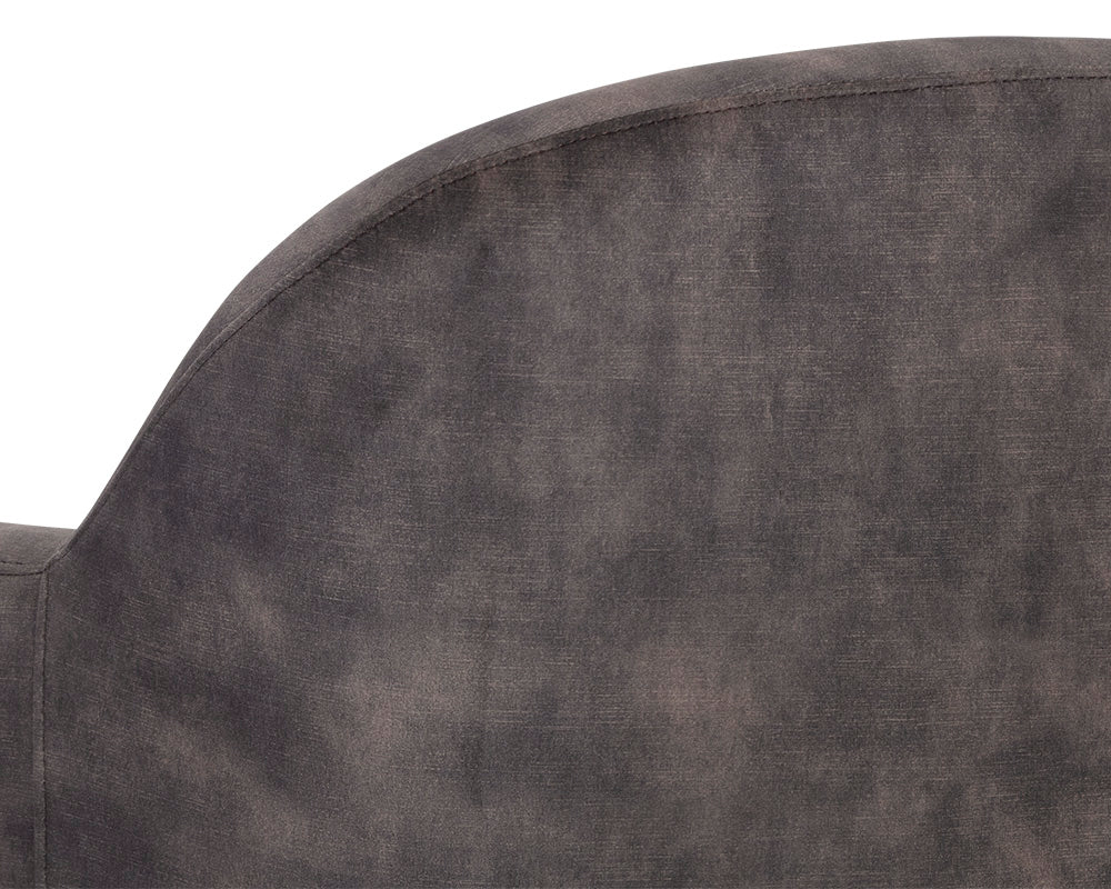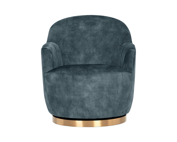 An elegant swivel chair perfect for living, lounge and office spaces. Features a modern barrelback design upholstered in nono cream, petrol and shitake fabrics. A gold stainless steel base with 360 degree swivel completes the design.