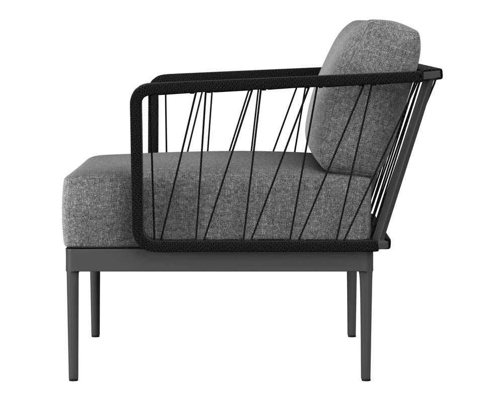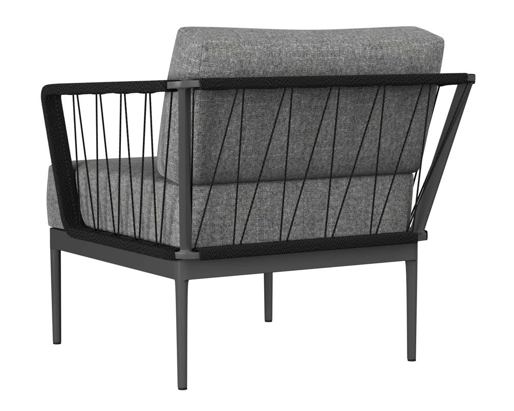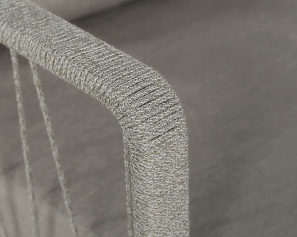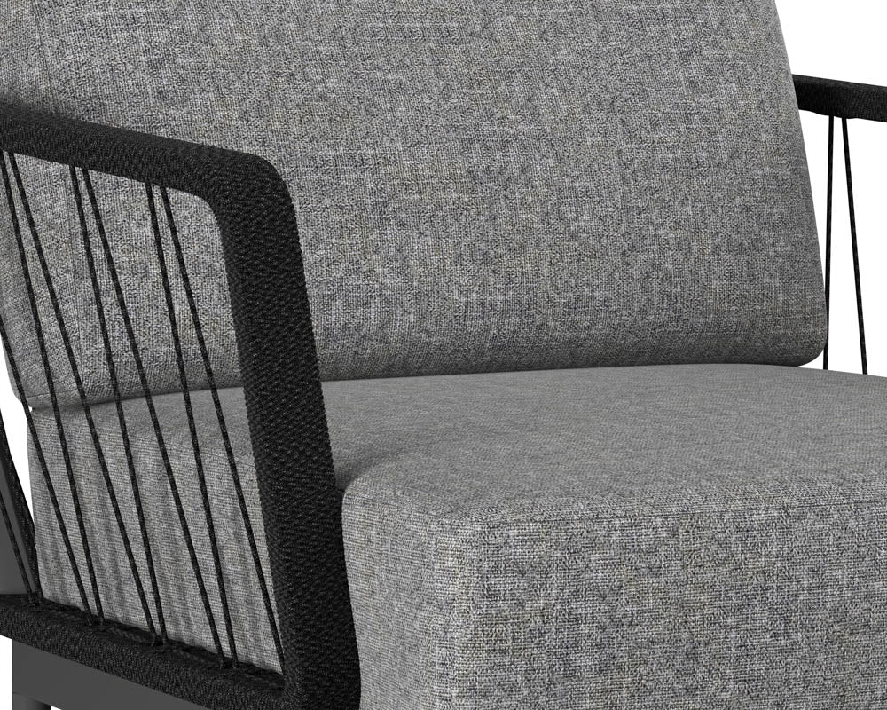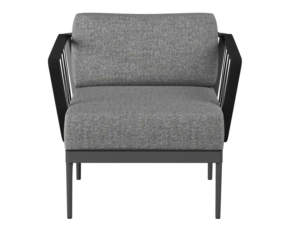 This beautiful outdoor armchair marries mixed materials and thoughtful design for an eye-catching look. Relax in a comfortable seat covered in covered in copacabana grey fabric and finished with a dark grey powder coated aluminum frame and dark grey weave.