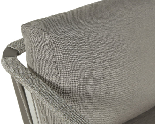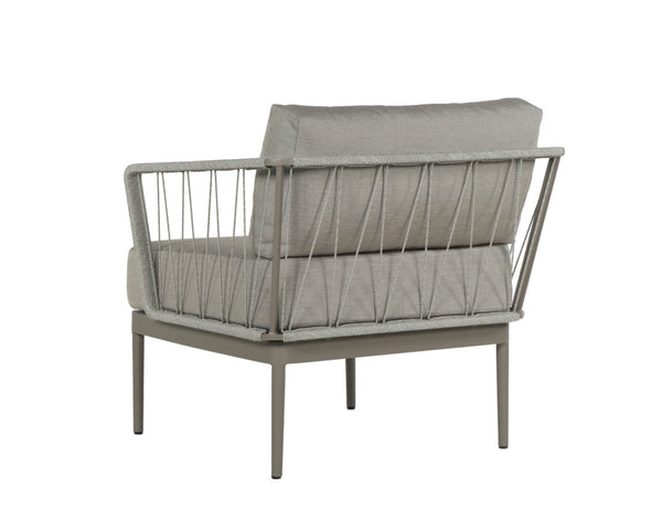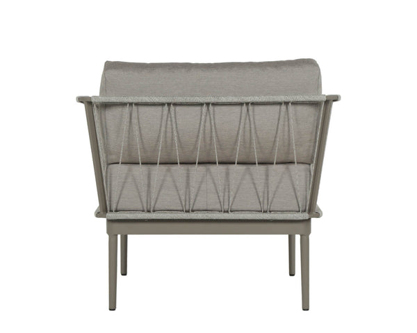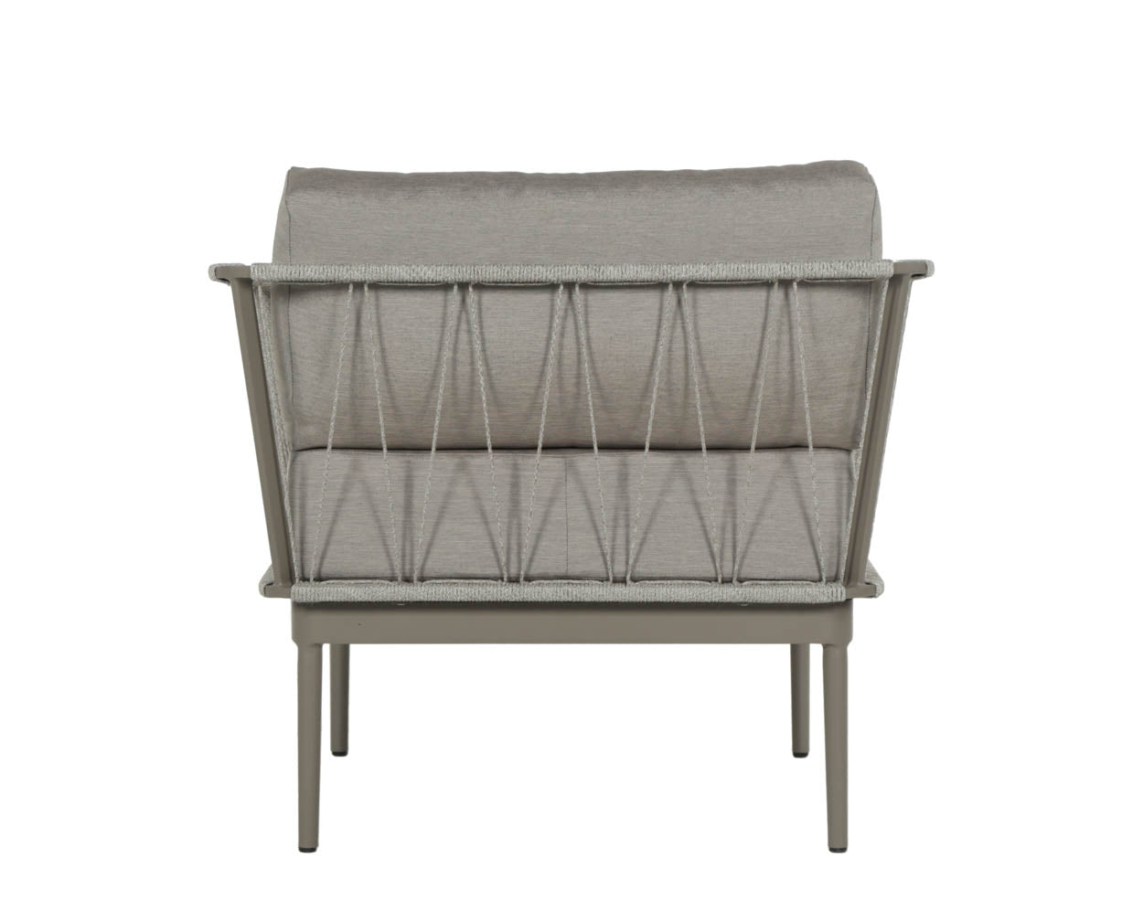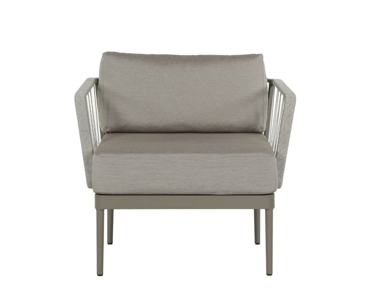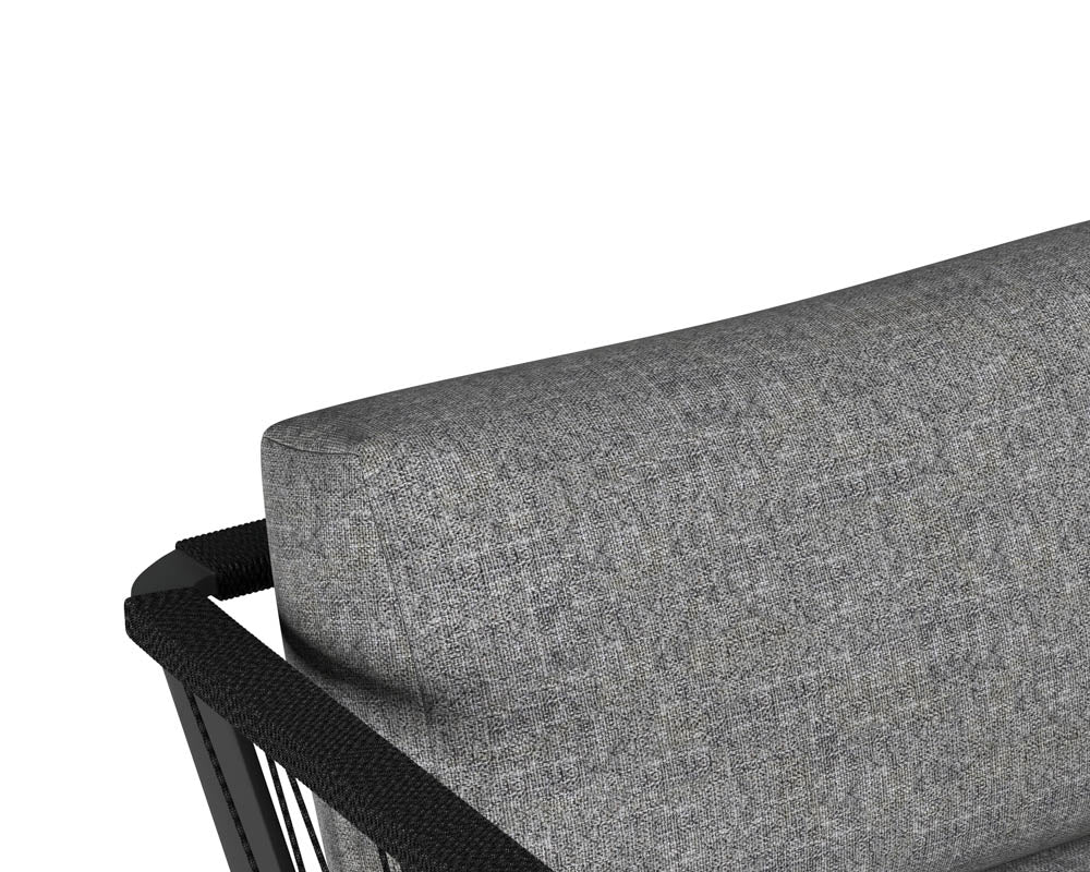 This beautiful outdoor armchair marries mixed materials and thoughtful design for an eye-catching look. Relax in a comfortable seat covered in covered in copacabana grey fabric and finished with a dark grey powder coated aluminum frame and dark grey weave.