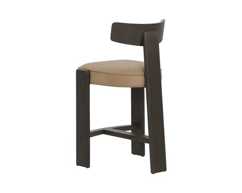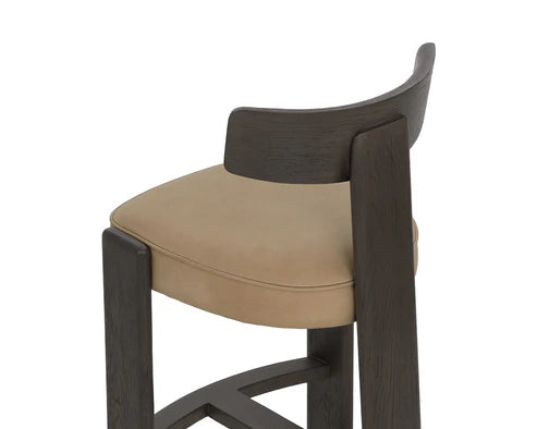 The Horton Counter Stool highlights the beauty of simplicity in contemporary design. A sculpted three-legged frame with a curved back constructed from dark brown oak wood embraces the comfort of a beautiful seat upholstered in our luxurious sahara sand top grain leather.