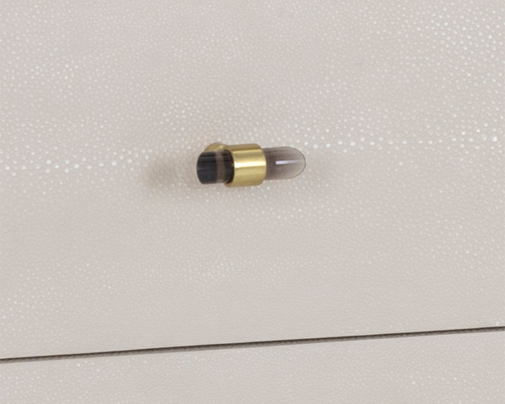 Boasting a professional and classic design, this magnificent desk is the ideal piece for productivity. Crafted from a wooden frame with a white ceruse oak veener top and features four drawers with oyster shagreen bonded leather coverings. Completed with antique brass iron handles and solid oak wood legs. Also available in a dark brown finish with grey shagreen combination.