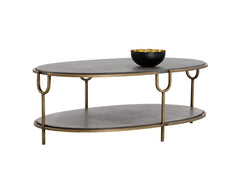 This oval shaped coffee table features a beautifully structured antique brass iron frame with a concrete top and shelf. A dramatic yet refined contemporary piece. Crafted from a natural concrete mix, each piece will look different, with variations of grey hues that will enhance over time.