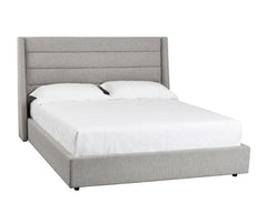 This upholstered bed features horizontal channel tufting for a modern look. Stocked in a marble, quarry or merino pearl fabric with espresso wood legs. No box spring is required and slats are included.