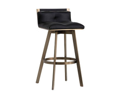 A stylish Art Deco inspired swivel barstool with a low profile seatback. Features a partially exposed frame and legs made of stainless steel with an antique brass finish. Swivel features 360 degree swivel. Suitable for residential and commercial environments.