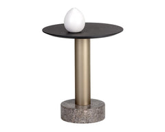 - This end table offers a contemporary look with an organic feel. Features a substantial light grey marble and dark grey iron base with a raw umber finished oak veneer top. Also available with a light grey marble and brushed gold iron base with a charcoal grey finished oak veneer top. Pair with matching coffee table for added dimension.