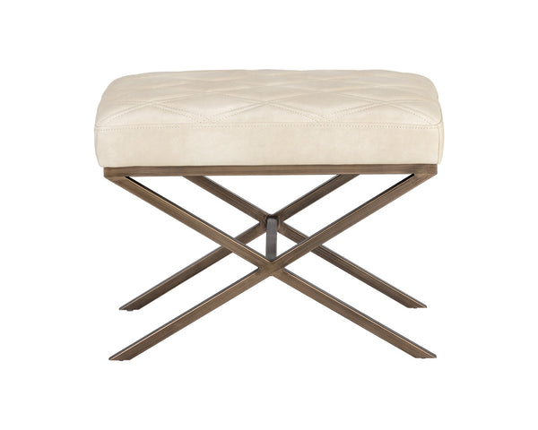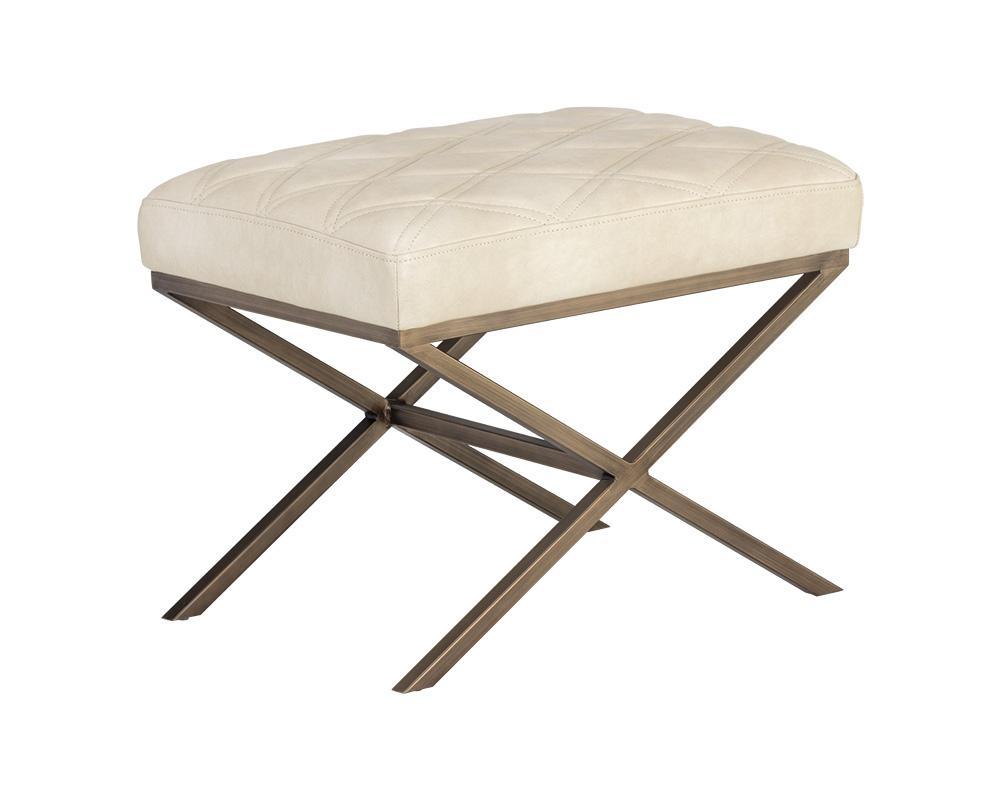 This handsome stool combines Old English flair with mid-century style. Features a double-stitched diamond pattern on the seat with an antique brass steel x-base. Stocked in our bravo cream and tobacco tan faux leather.