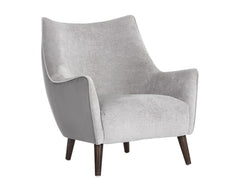 A charming mid-century inspired lounge chair with a sculpted seatback and tapered wood legs. Features a petite frame with a low seat. Stocked in polo club kohl grey fabric with a contrasting antonio black fabric seat or polo club stone fabric with a contrasting antonio charcoal fabric seat.