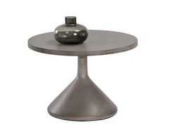 Inspired by brutalist architecture, this concrete coffee table will be a bold addition to your space. Features a grey concrete round top with a solid base. Can be paired with matching end table. Crafted from a natural concrete mix, each piece will look different, with variations of hues that will enhance over time. Suitable for indoor and covered outdoor spaces.